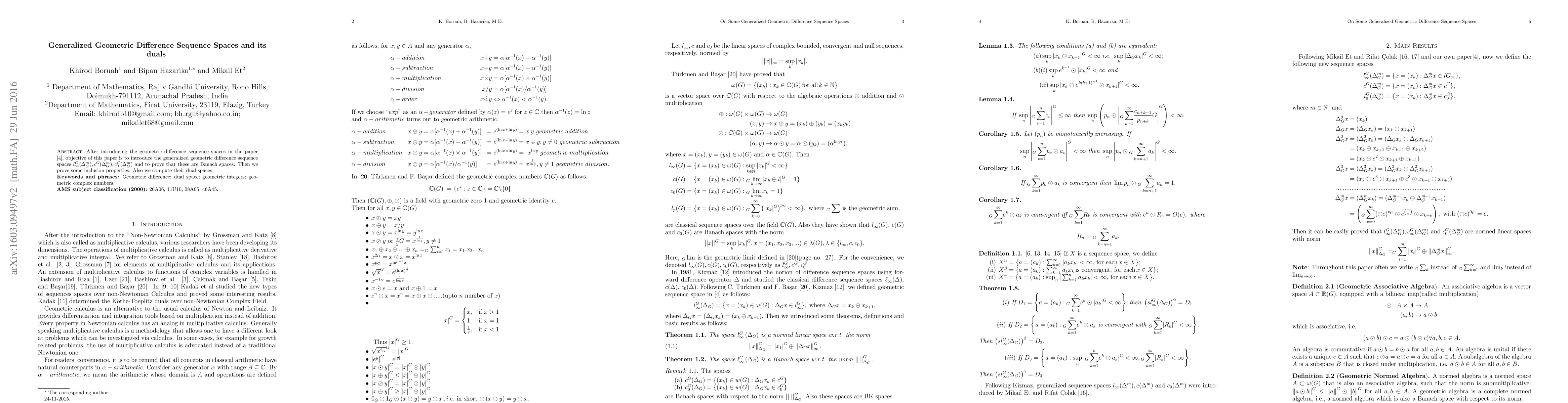 Objective of this paper is to introduce the generalized geometric difference sequence spaces $l_\infty^{G}(\Delta^m_G), c^G(\Delta^m_G), c_0^{G}(\Delta^m_G)$ and to prove that these are Banach spaces. Then we prove some inclusion properties. Also we compute their dual spaces.