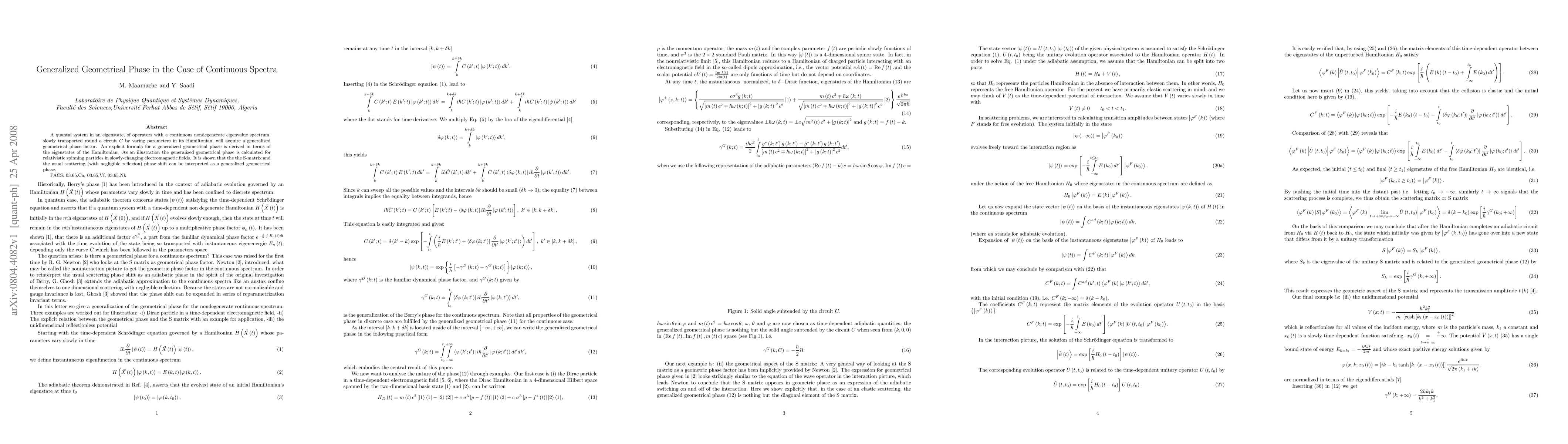 A quantal system in an eigenstate, of operators with a continuous nondegenerate eigenvalue spectrum, slowly transported round a circuit C by varing parameters in its Hamiltonian, will acquire a generalized geometrical phase factor. An explicit formula for a generalized geometrical phase is derived in terms of the eigenstates of the Hamiltonian. As an illustration the generalized geometrical phase is calculated for relativistic spinning particles in slowly-changing electromagnetic fields. It is shown that the the S-matrix and the usual scattering (with negligible reflexion) phase shift can be interpreted as a generalized geometrical phase.