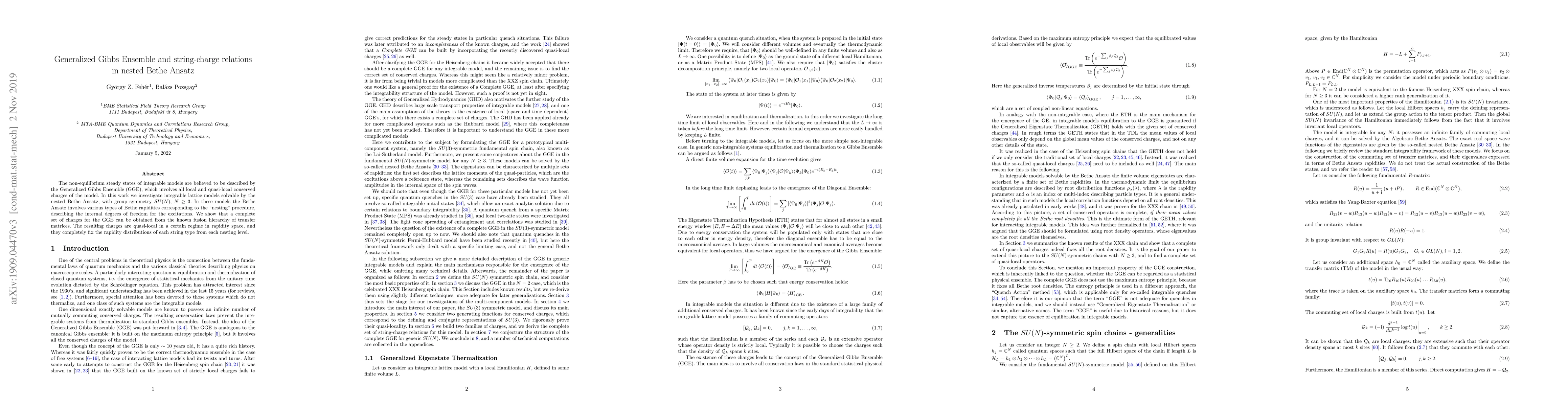 This paper explores the Generalized Gibbs Ensemble (GGE) for integrable lattice models solvable via the nested Bethe Ansatz with $SU(N)$ symmetry. It establishes a connection between the GGE's conserved charges and the fusion hierarchy of transfer matrices, revealing quasi-local charges that determine the rapidity distributions for different string types.