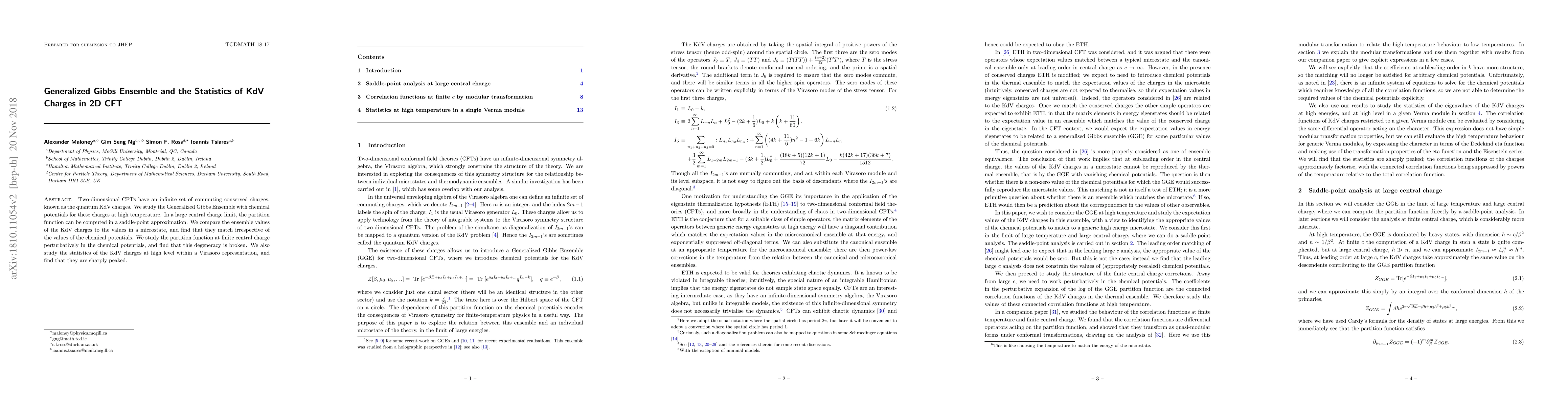 This paper investigates the Generalized Gibbs Ensemble in two-dimensional conformal field theories (CFTs) using quantum KdV charges, finding that ensemble values match microstate values at high temperature and large central charge. At finite central charge, this degeneracy is lost, and the KdV charges exhibit sharply peaked statistics at high levels.