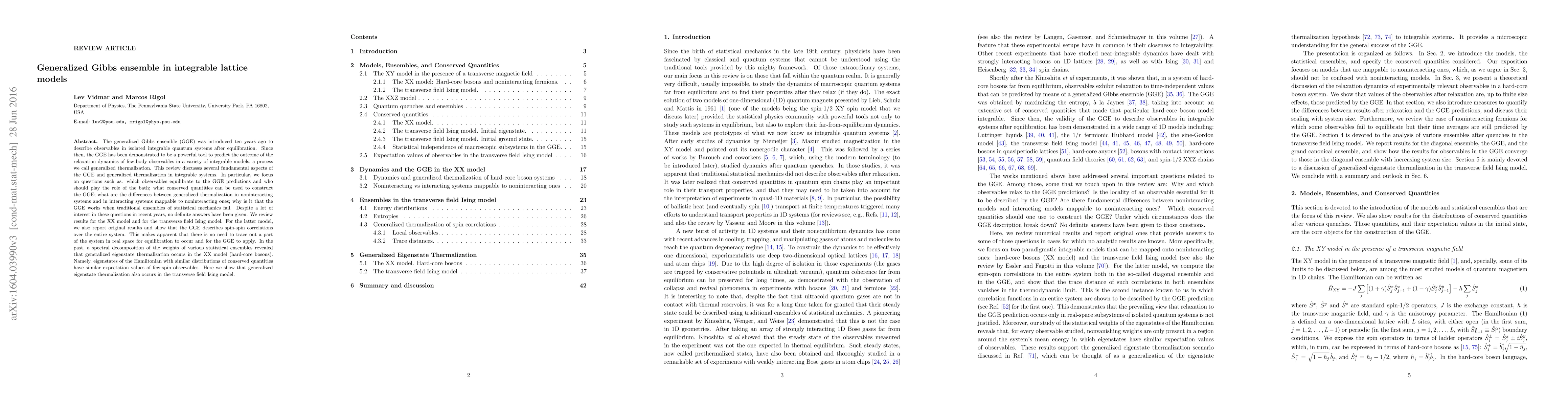 This paper reviews the generalized Gibbs ensemble (GGE) and its role in predicting the relaxation dynamics of observables in integrable quantum systems, termed generalized thermalization. It highlights the GGE's applicability across various models, including the XX model and the transverse field Ising model, and discusses the absence of a need to trace out parts of the system for equilibration, demonstrating that GGE can describe spin-spin correlations throughout the system.