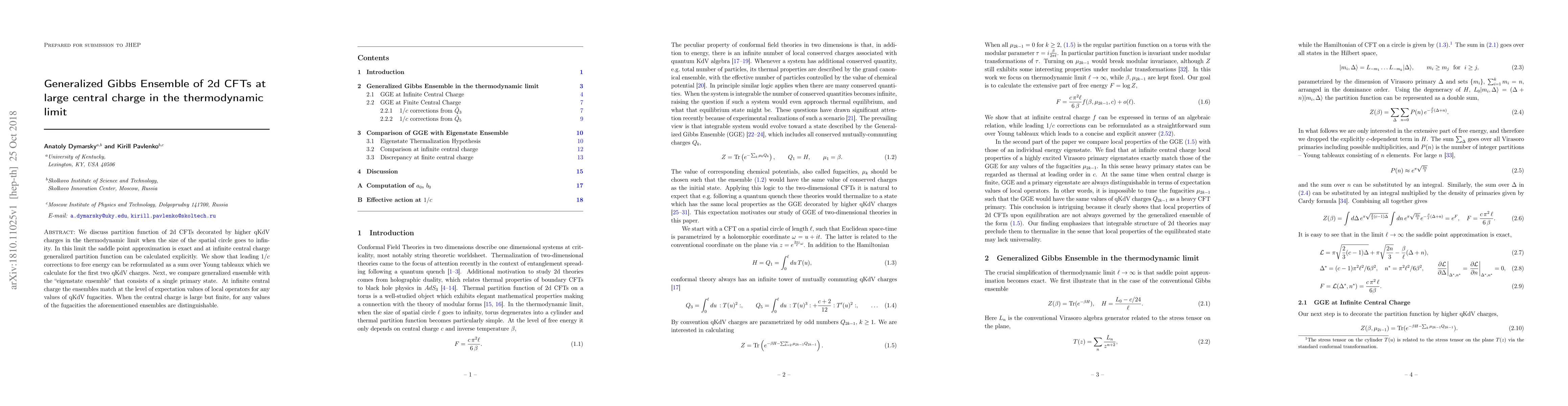 We discuss partition function of 2d CFTs decorated by higher qKdV charges in the thermodynamic limit when the size of the spatial circle goes to infinity. In this limit the saddle point approximation is exact and at infinite central charge generalized partition function can be calculated explicitly. We show that leading 1/c corrections to free energy can be reformulated as a sum over Young tableaux which we calculate for the first two qKdV charges. Next, we compare generalized ensemble with the "eigenstate ensemble" that consists of a single primary state. At infinite central charge the ensembles match at the level of expectation values of local operators for any values of qKdV fugacities. When the central charge is large but finite, for any values of the fugacities the aforementioned ensembles are distinguishable.