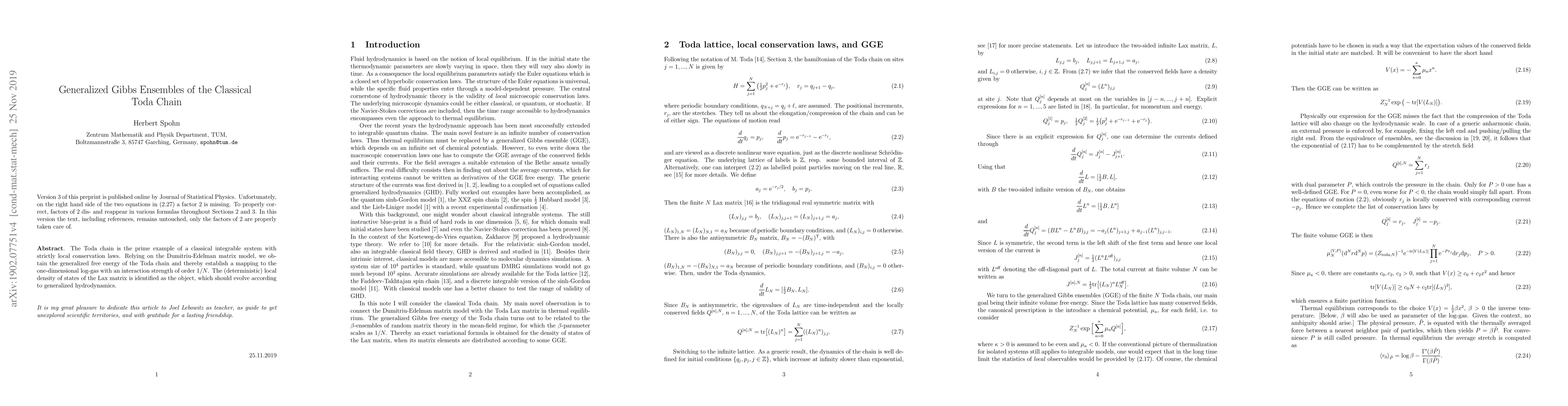 Researchers mapped the Toda chain to a one-dimensional log-gas model, establishing a connection between its generalized free energy and the Lax matrix's local density of states. This mapping enables the prediction of the system's behavior according to generalized hydrodynamics.