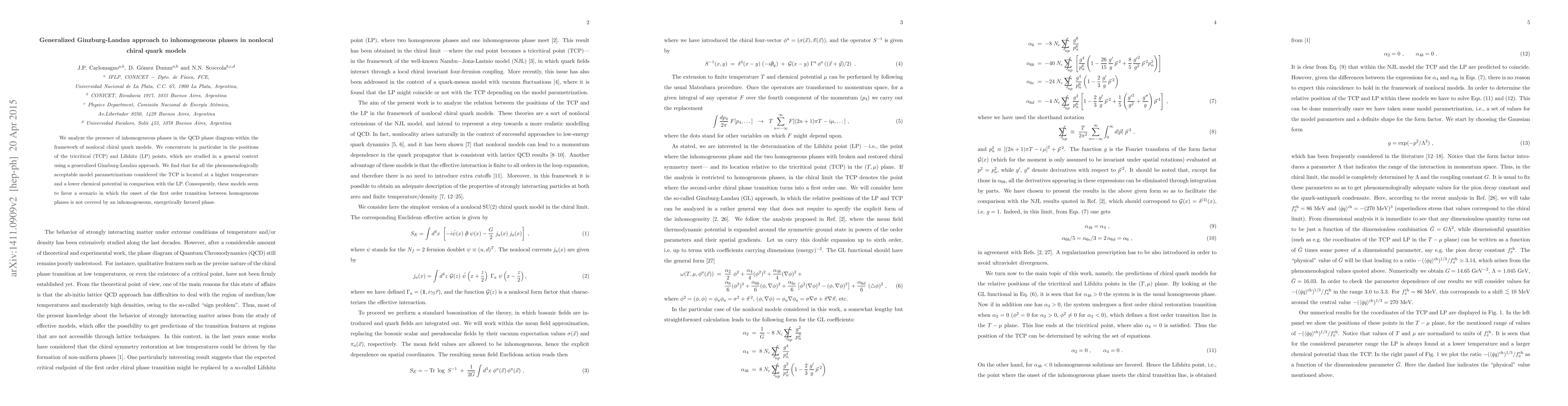This paper investigates inhomogeneous phases in the QCD phase diagram using nonlocal chiral quark models and a generalized Ginzburg-Landau approach. The study finds that tricritical and Lifshitz points are positioned such that the first-order transition onset is not dominated by an energetically preferred inhomogeneous phase.