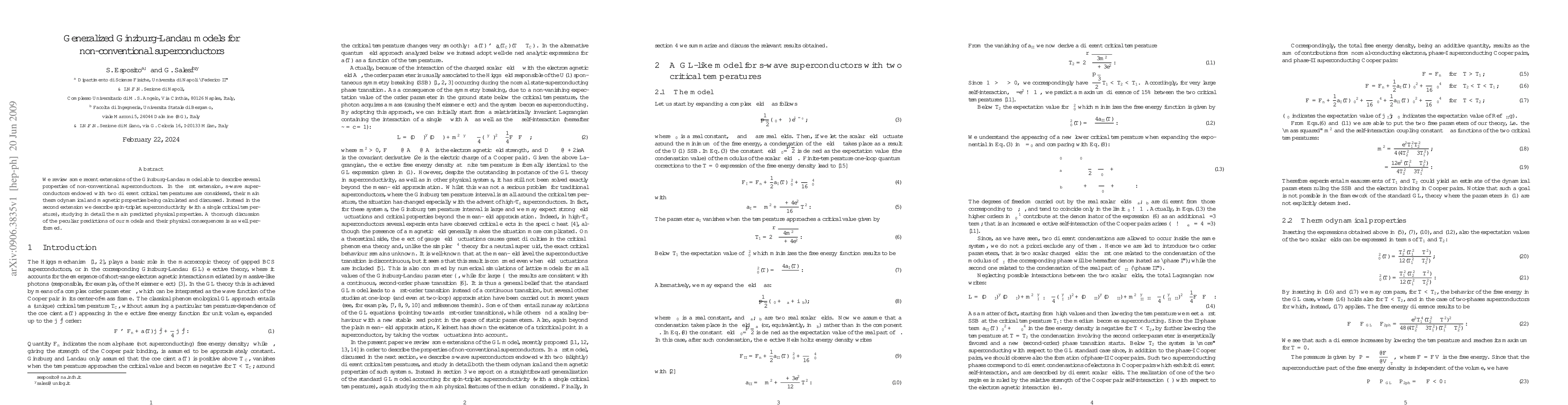This paper reviews recent extensions of the Ginzburg-Landau model to describe non-conventional superconductors, including s-wave superconductors with dual critical temperatures and spin-triplet superconductivity, analyzing their thermodynamical, magnetic, and physical properties. The study discusses the unique predictions and implications of these models.