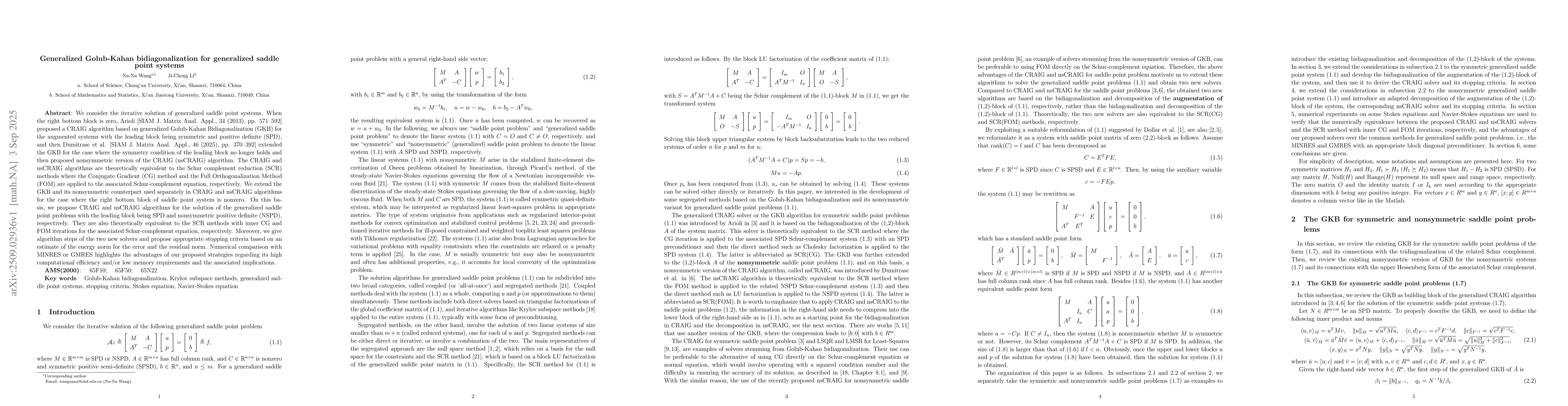 We consider the iterative solution of generalized saddle point systems. When the right bottom block is zero, Arioli [SIAM J. Matrix Anal. Appl., 34 (2013), pp. 571--592] proposed a CRAIG algorithm based on generalized Golub-Kahan Bidiagonalization (GKB) for the augmented systems with the leading block being symmetric and positive definite (SPD), and then Dumitrasc et al. [SIAM J. Matrix Anal. Appl., 46 (2025), pp. 370--392] extended the GKB for the case where the symmetry condition of the leading block no longer holds and then proposed nonsymmetric version of the CRAIG (nsCRAIG) algorithm. The CRAIG and nsCRAIG algorithms are theoretically equivalent to the Schur complement reduction (SCR) methods where the Conjugate Gradient (CG) method and the Full Orthogonalization Method (FOM) are applied to the associated Schur-complement equation, respectively. We extend the GKB and its nonsymmetric counterpart used separately in CRAIG and nsCRAIG algorithms for the case where the right bottom block of saddle point system is nonzero. On this basis, we propose CRAIG and nsCRAIG algorithms for the solution of the generalized saddle point problems with the leading block being SPD and nonsymmetric positive definite (NSPD), respectively. They are also theoretically equivalent to the SCR methods with inner CG and FOM iterations for the associated Schur-complement equation, respectively. Moreover, we give algorithm steps of the two new solvers and propose appropriate stopping criteria based on an estimate of the energy norm for the error and the residual norm. Numerical comparison with MINRES or GMRES highlights the advantages of our proposed strategies regarding its high computational efficiency and/or low memory requirements and the associated implications.