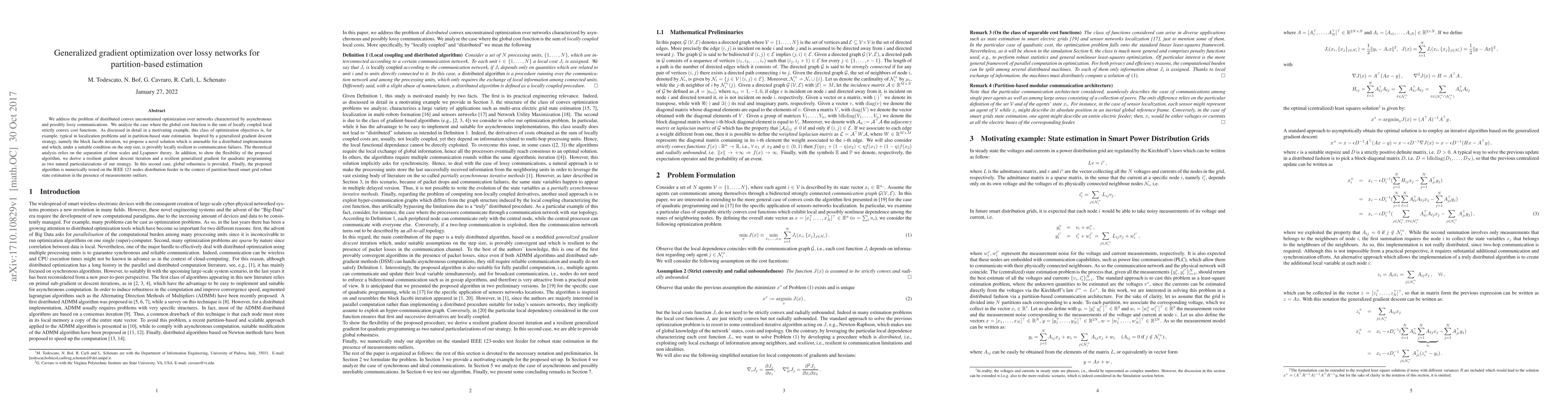 This paper proposes a distributed optimization method for convex unconstrained problems over lossy networks, using a generalized gradient descent strategy. The algorithm is resilient to communication failures and is tested on a smart grid state estimation problem.