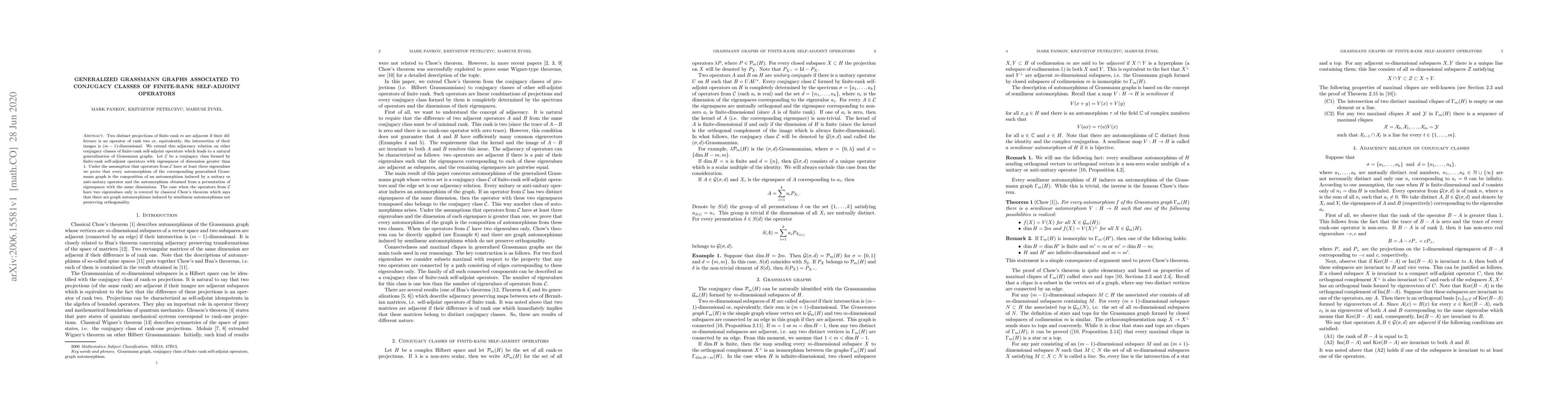 Two distinct projections of finite rank $m$ are adjacent if their difference is an operator of rank two or, equivalently, the intersection of their images is $(m-1)$-dimensional. We extend this adjacency relation on other conjugacy classes of finite-rank self-adjoint operators which leads to a natural generalization of Grassmann graphs. Let ${\mathcal C}$ be a conjugacy class formed by finite-rank self-adjoint operators with eigenspaces of dimension greater than $1$. Under the assumption that operators from ${\mathcal C}$ have at least three eigenvalues we prove that every automorphism of the corresponding generalized Grassmann graph is the composition of an automorphism induced by a unitary or anti-unitary operator and the automorphism obtained from a permutation of eigenspaces with the same dimensions. The case when the operators from ${\mathcal C}$ have two eigenvalues only is covered by classical Chow's theorem which says that there are graph automorphisms induced by semilinear automorphisms not preserving orthogonality.