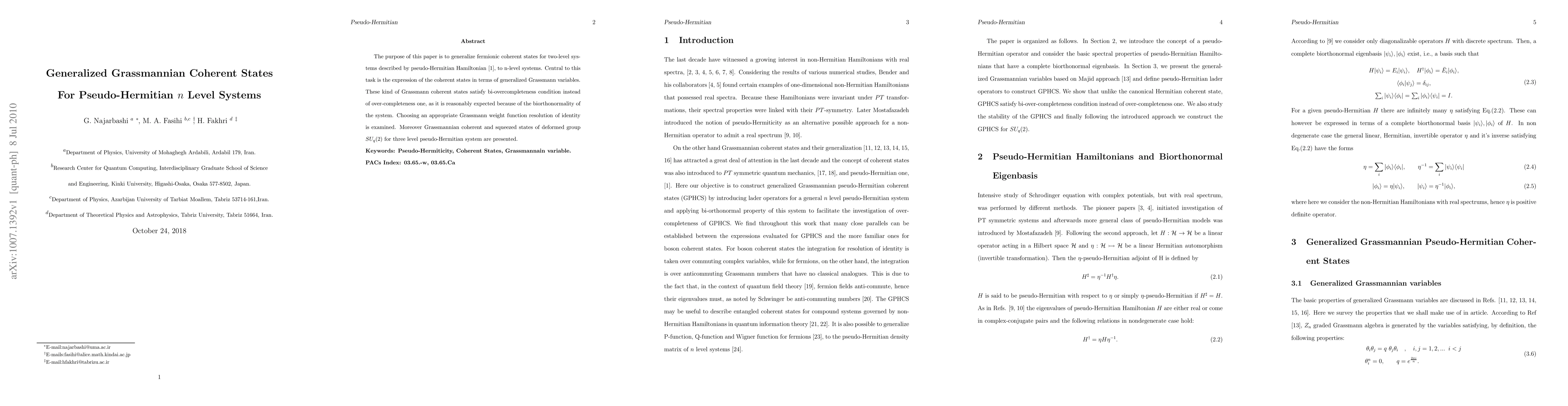 This paper generalizes fermionic coherent states for n-level pseudo-Hermitian systems using generalized Grassmann variables, satisfying a bi-overcompleteness condition due to system biorthonormality. It also explores Grassmannian coherent and squeezed states for a deformed $SU_{q}(2)$ three-level system.