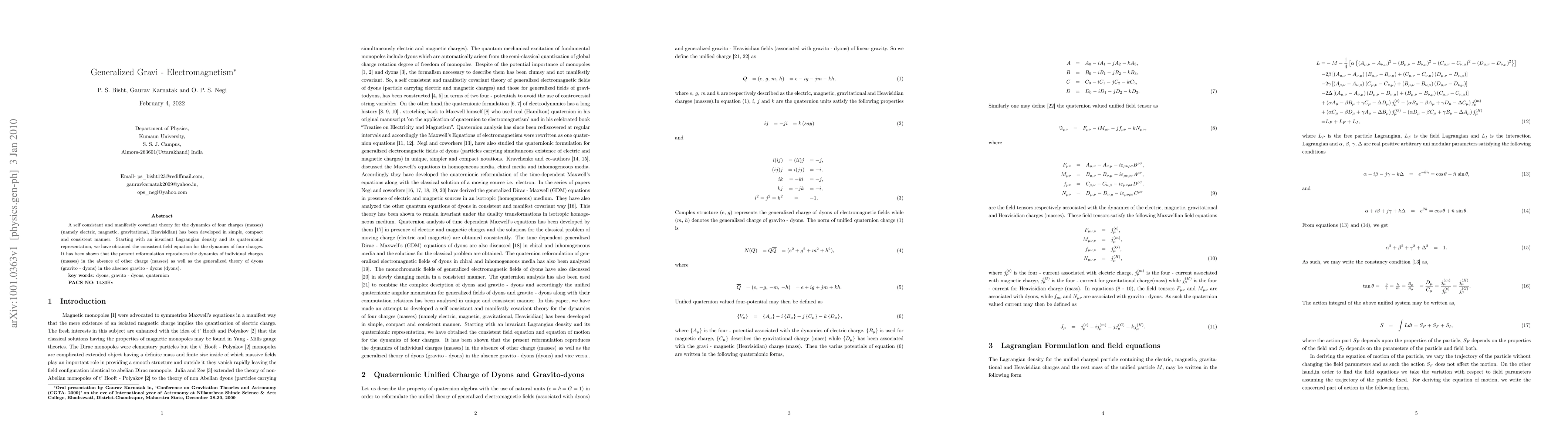 A self consistant and manifestly covariant theory for the dynamics of four charges (masses) (namely electric, magnetic, gravitational, Heavisidian) has been developed in simple, compact and consistent manner. Starting with an invariant Lagrangian density and its quaternionic representation, we have obtained the consistent field equation for the dynamics of four charges. It has been shown that the present reformulation reproduces the dynamics of individual charges (masses) in the absence of other charge (masses) as well as the generalized theory of dyons (gravito - dyons) in the absence gravito - dyons (dyons). key words: dyons, gravito - dyons, quaternion PACS NO: 14.80Hv