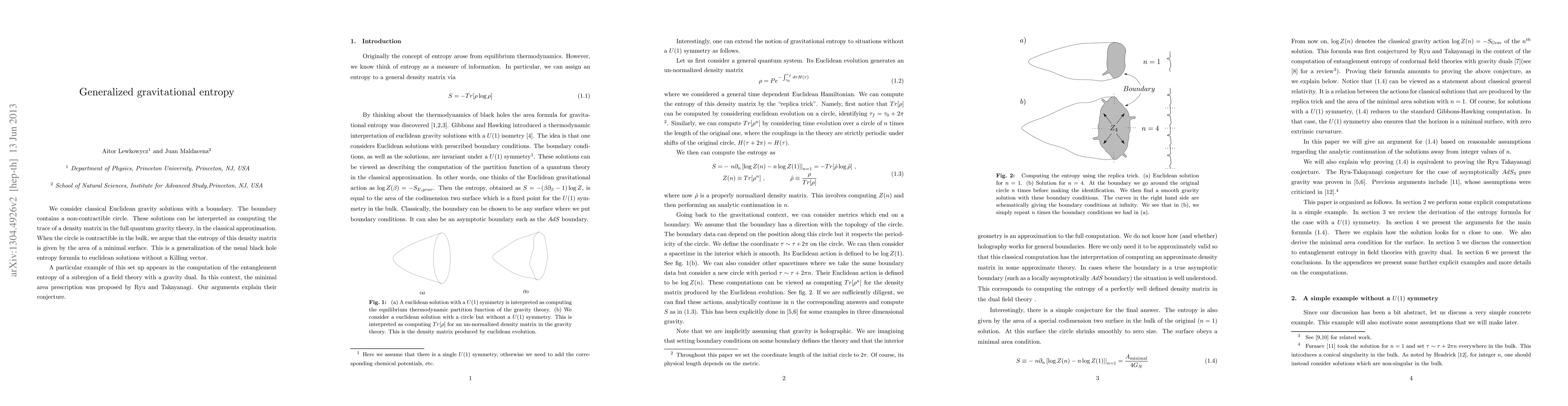 We consider classical Euclidean gravity solutions with a boundary. The boundary contains a non-contractible circle. These solutions can be interpreted as computing the trace of a density matrix in the full quantum gravity theory, in the classical approximation. When the circle is contractible in the bulk, we argue that the entropy of this density matrix is given by the area of a minimal surface. This is a generalization of the usual black hole entropy formula to euclidean solutions without a Killing vector. A particular example of this set up appears in the computation of the entanglement entropy of a subregion of a field theory with a gravity dual. In this context, the minimal area prescription was proposed by Ryu and Takayanagi. Our arguments explain their conjecture.