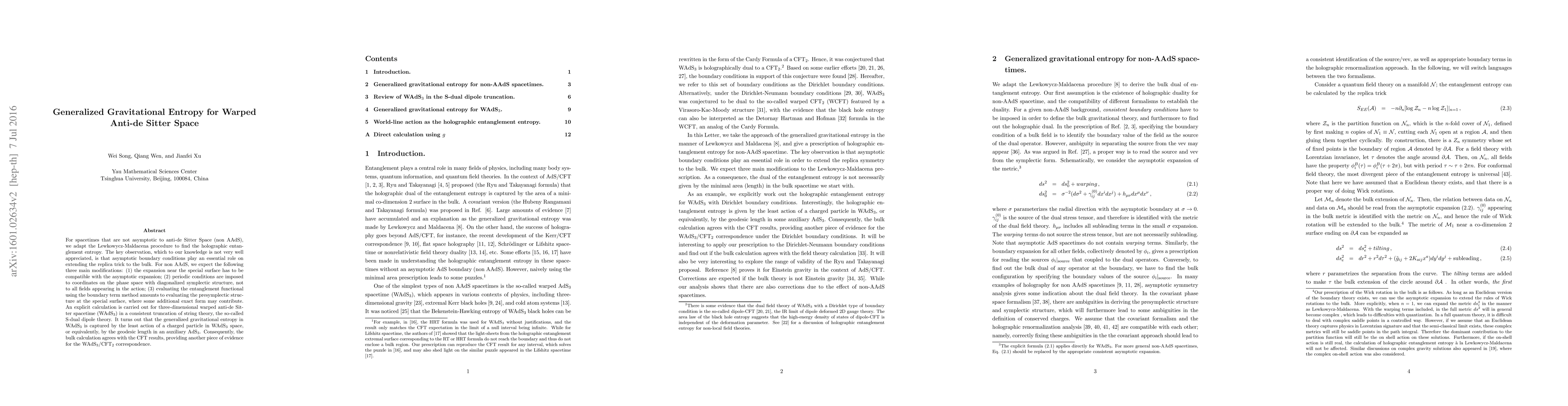 For spacetimes that are not asymptotic to anti-de Sitter Space (non AAdS), we adapt the Lewkowycz-Maldacena procedure to find the holographic entanglement entropy. The key observation, which to our knowledge is not very well appreciated, is that asymptotic boundary conditions play an essential role on extending the replica trick to the bulk. For non AAdS, we expect the following three main modifications: (1) the expansion near the special surface has to be compatible with the asymptotic expansion; (2) periodic conditions are imposed to coordinates on the phase space with diagonalized symplectic structure, not to all fields appearing in the action; (3) evaluating the entanglement functional using the boundary term method amounts to evaluating the presymplectic structure at the special surface, where some additional exact form may contribute. An explicit calculation is carried out for three-dimensional warped anti-de Sitter spacetime (WAdS3) in a consistent truncation of string theory, the so-called S-dual dipole theory. It turns out that the generalized gravitational entropy in WAdS3 is captured by the least action of a charged particle in WAdS3 space, or equivalently, by the geodesic length in an auxiliary AdS3. Consequently, the bulk calculation agrees with the CFT results, providing another piece of evidence for the WAdS3/CFT2 correspondence.