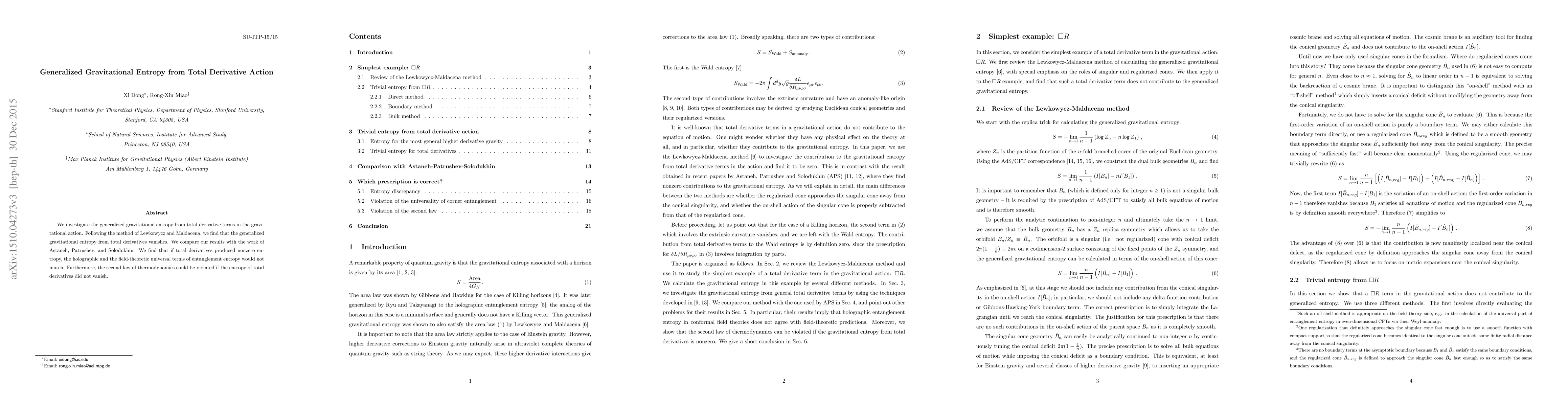 This paper investigates the gravitational entropy arising from total derivative terms in the gravitational action, finding that such entropy vanishes. The results align with the matching of holographic and field-theoretic universal terms of entanglement entropy, and suggest that the second law of thermodynamics would be violated if total derivative entropy were non-zero.