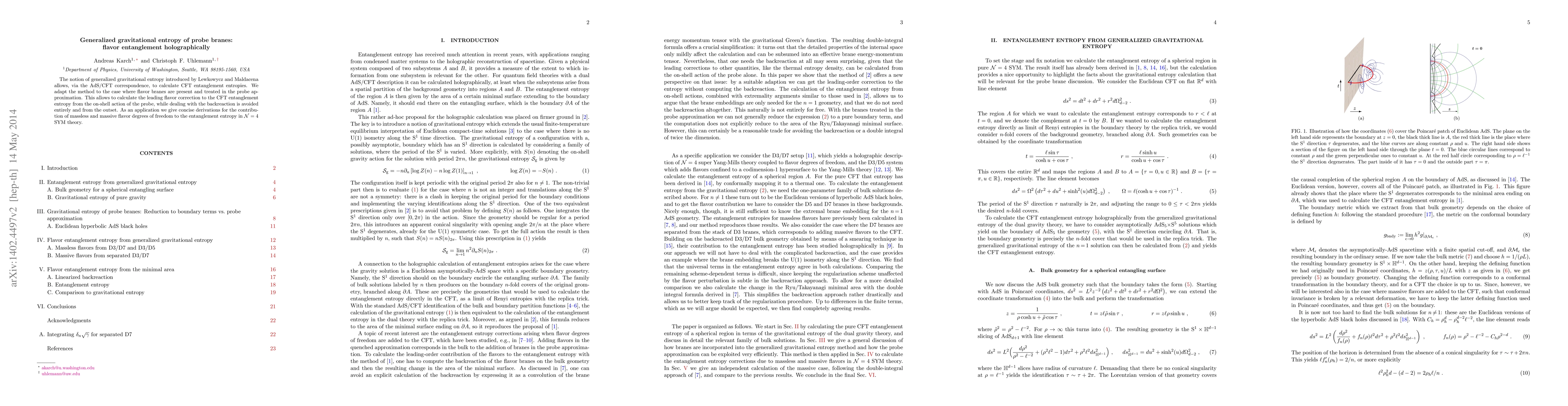This paper adapts the generalized gravitational entropy method to probe branes in the presence of flavor fields, calculating the leading flavor correction to CFT entanglement entropy without considering backreaction. It provides concise derivations for the entanglement entropy contributions from massless and massive flavor degrees of freedom in N=4 SYM theory.
