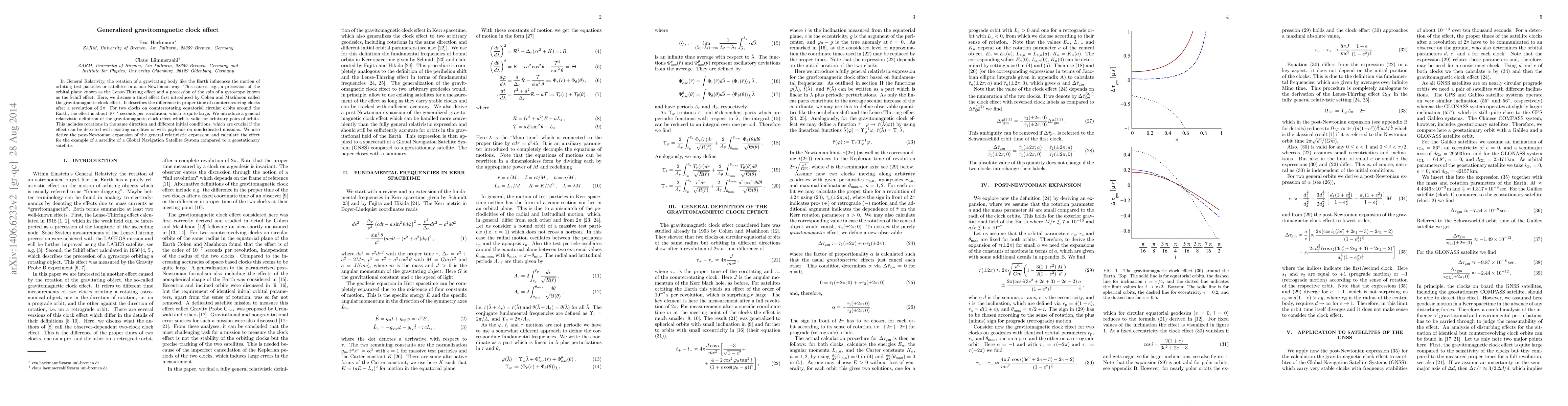 This paper discusses the generalized gravitomagnetic clock effect in General Relativity, which describes the difference in proper time between counterrevolving clocks due to the rotation of a gravitating body. It provides a general relativistic definition applicable to various orbits and calculates the effect for a GNSS satellite compared to a geostationary satellite.