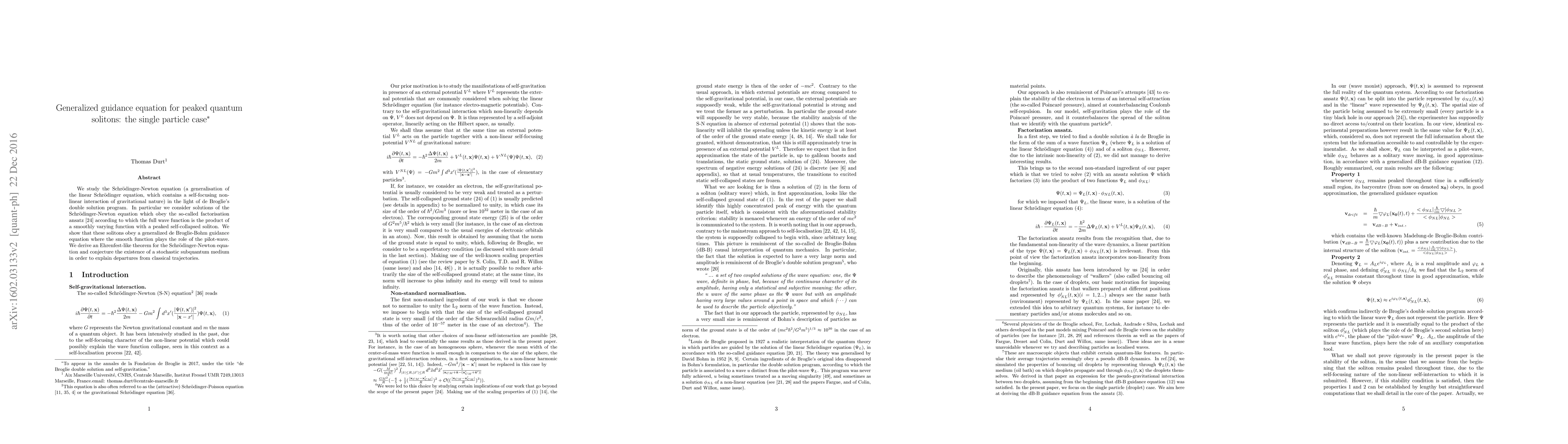 This research derives a generalized guidance equation for peaked quantum solitons in the non-linear Schrödinger equation, showing they move along de Broglie-Bohm velocity in the non-relativistic limit. For spinorial electronic wave functions, the barycentre's motion aligns with the de Broglie-Bohm guidance equation.