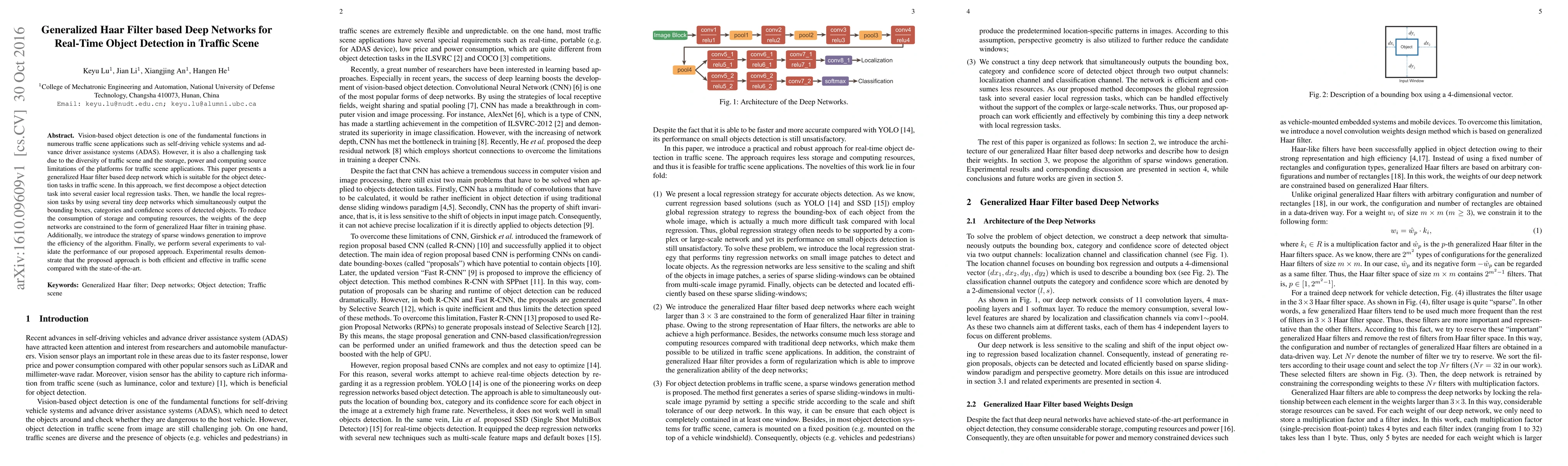 A novel deep network approach is proposed for real-time object detection in traffic scenes, using a generalized Haar filter to reduce storage and computing requirements while maintaining accuracy.
