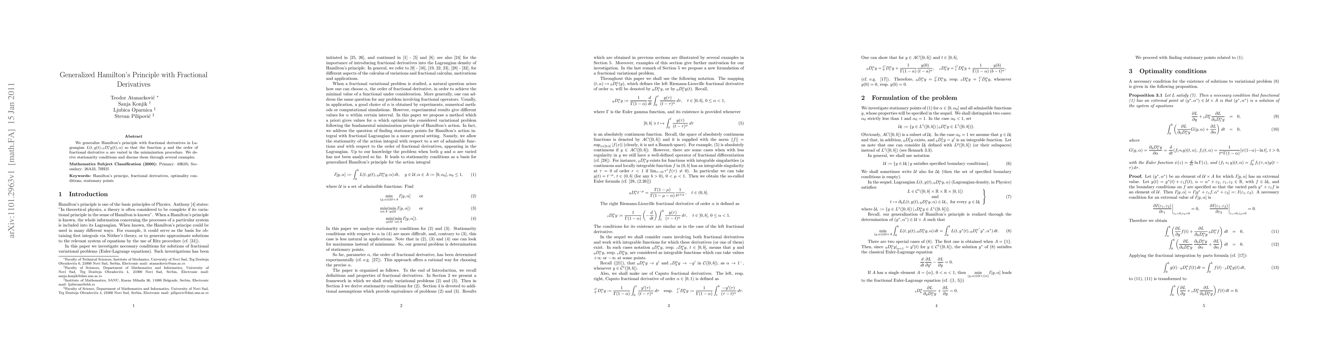 This paper generalizes Hamilton's principle to incorporate fractional derivatives, deriving new stationarity conditions for the Lagrangian $L(t,y(t),{}_0D_t^\al y(t),\alpha)$ where $y$ and the fractional derivative order $\alpha$ are varied. The derived conditions are illustrated through various examples.
