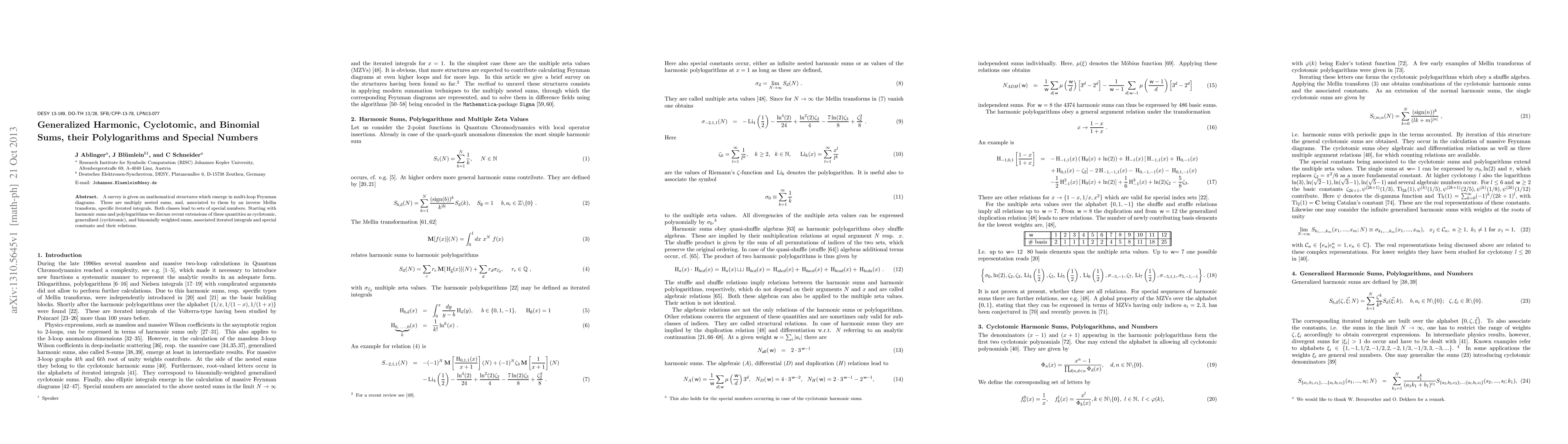 This paper surveys mathematical structures arising in multi-loop Feynman diagrams, focusing on generalized harmonic, cyclotomic, and binomial sums and their associated iterated integrals, leading to special numbers and constants. It explores recent extensions of harmonic sums and polylogarithms and their relationships.