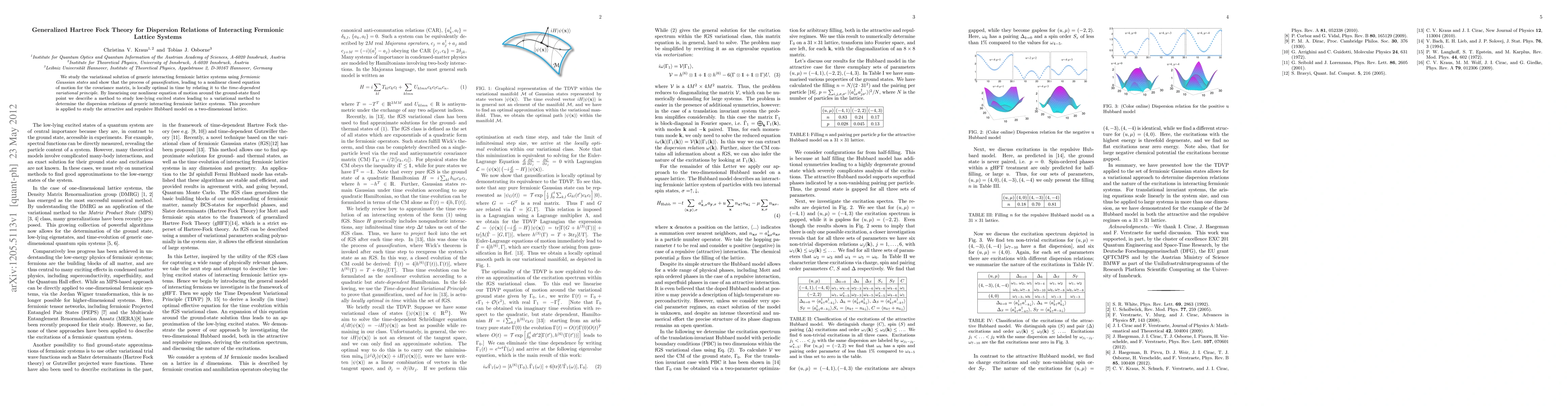 We study the variational solution of generic interacting fermionic lattice systems using fermionic Gaussian states and show that the process of "gaussification", leading to a nonlinear closed equation of motion for the covariance matrix, is locally optimal in time by relating it to the time-dependent variational principle. By linearising our nonlinear equation of motion around the ground-state fixed point we describe a method to study low-lying excited states leading to a variational method to determine the dispersion relations of generic interacting fermionic lattice systems. This procedure is applied to study the attractive and repulsive Hubbard model on a two-dimensional lattice.
