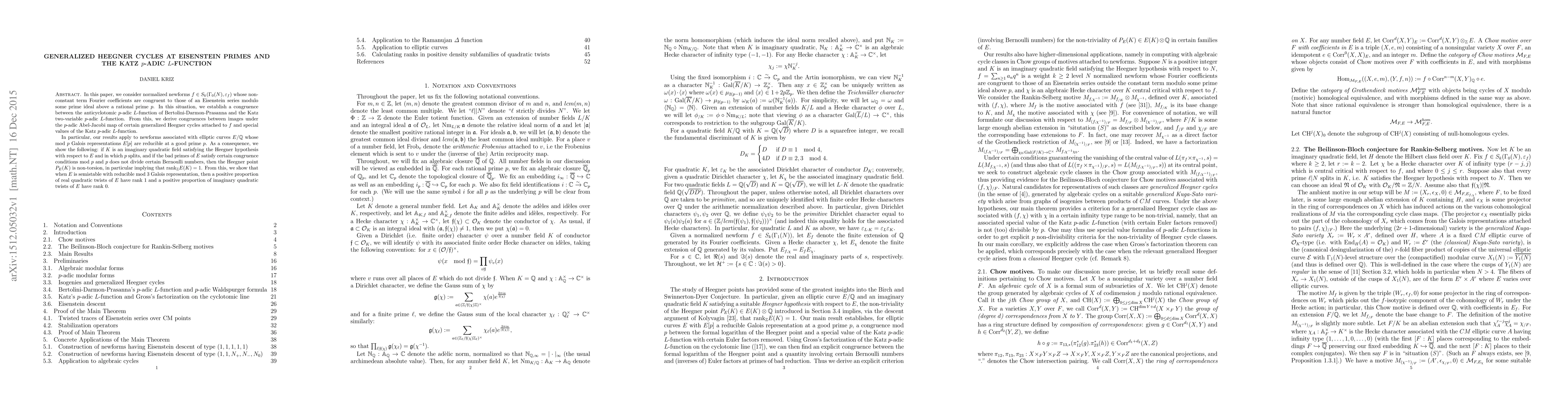 In this paper, we consider normalized newforms $f\in S_k(\Gamma_0(N),\varepsilon_f)$ whose non-constant term Fourier coefficients are congruent to those of an Eisenstein series modulo some prime ideal above a rational prime $p$. In this situation, we establish a congruence between the anticyclotomic $p$-adic $L$-function of Bertolini-Darmon-Prasanna and the Katz two-variable $p$-adic $L$-function. From this, we derive congruences between images under the $p$-adic Abel-Jacobi map of certain generalized Heegner cycles attached to $f$ and special values of the Katz $p$-adic $L$-function. In particular, our results apply to newforms associated with elliptic curves $E/\mathbb{Q}$ whose mod $p$ Galois representations $E[p]$ are reducible at a good prime $p$. As a consequence, we show the following: if $K$ is an imaginary quadratic field satisfying the Heegner hypothesis with respect to $E$ and in which $p$ splits, and if the bad primes of $E$ satisfy certain congruence conditions mod $p$ and $p$ does not divide certain Bernoulli numbers, then the Heegner point $P_{E}(K)$ is non-torsion, in particular implying that $\text{rank}_{\mathbb{Z}}E(K) = 1$. From this, we show that when $E$ is semistable with reducible mod $3$ Galois representation, then a positive proportion of real quadratic twists of $E$ have rank 1 and a positive proportion of imaginary quadratic twists of $E$ have rank 0.