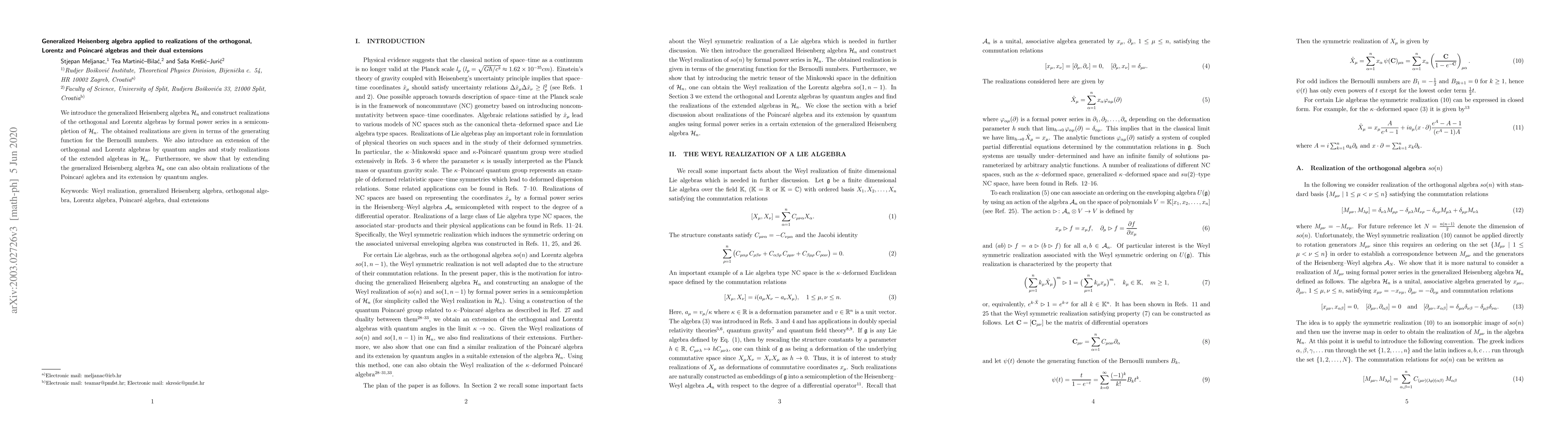 The paper introduces the generalized Heisenberg algebra $\mathcal{H}_n$ and constructs realizations of the orthogonal, Lorentz, and Poincare algebras using power series in a semicompletion of $\mathcal{H}_n$, given in terms of generating functions for Bernoulli numbers. It also explores extensions of these algebras by quantum angles.