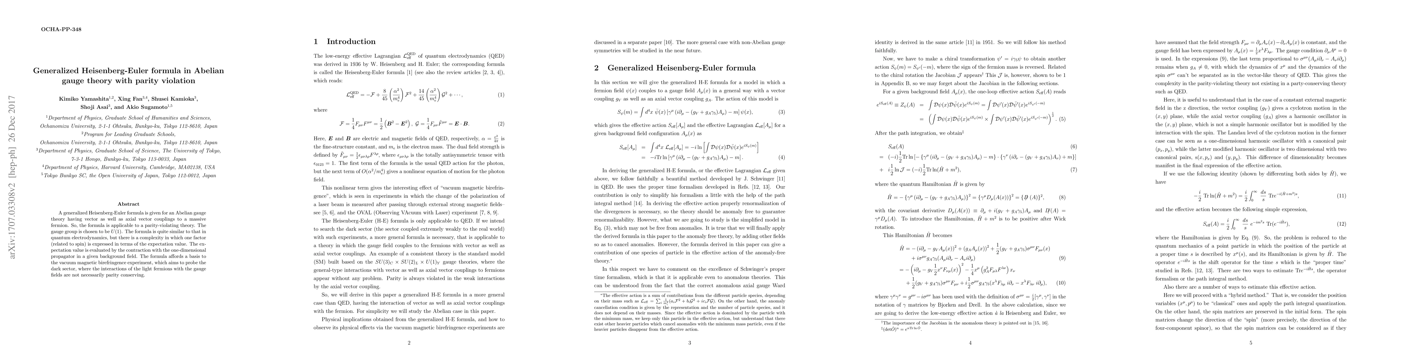 A generalized Heisenberg-Euler formula is given for an Abelian gauge theory having vector as well as axial vector couplings to a massive fermion. So, the formula is applicable to a parity-violating theory. The gauge group is chosen to be $U(1)$. The formula is quite similar to that in quantum electrodynamics, but there is a complexity in which one factor (related to spin) is expressed in terms of the expectation value. The expectation value is evaluated by the contraction with the one-dimensional propagator in a given background field. The formula affords a basis to the vacuum magnetic birefringence experiment, which aims to probe the dark sector, where the interactions of the light fermions with the gauge fields are not necessarily parity conserving.