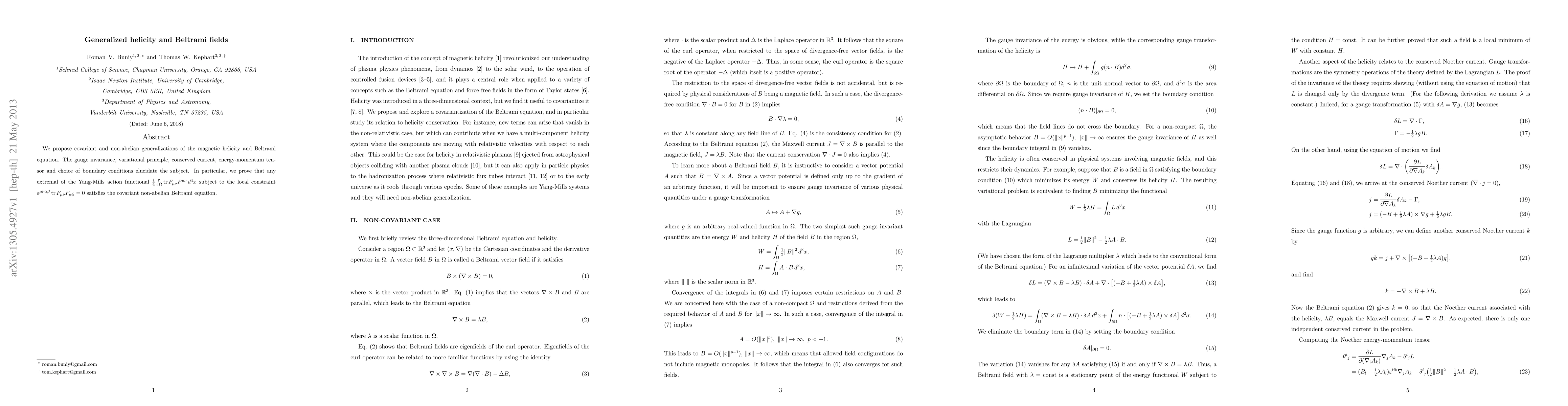 This research paper proposes non-abelian generalizations of magnetic helicity and Beltrami equation, proving that any Yang-Mills action functional extremal satisfies a covariant Beltrami equation, with implications for understanding gauge-invariant physics.