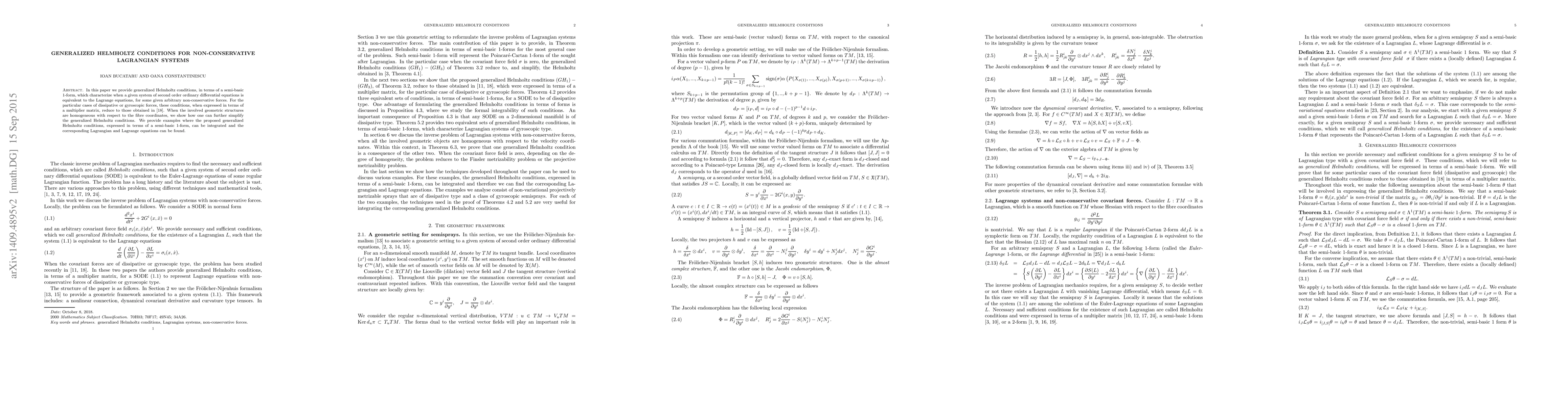 In this paper we provide generalized Helmholtz conditions, in terms of a semi-basic 1-form, which characterize when a given system of second order ordinary differential equations is equivalent to the Lagrange equations, for some given arbitrary non-conservative forces. For the particular cases of dissipative or gyroscopic forces, these conditions, when expressed in terms of a multiplier matrix, reduce to those obtained in [18]. When the involved geometric structures are homogeneous with respect to the fibre coordinates, we show how one can further simplify the generalized Helmholtz conditions. We provide examples where the proposed generalized Helmholtz conditions, expressed in terms of a semi-basic 1-form, can be integrated and the corresponding Lagrangian and Lagrange equations can be found.