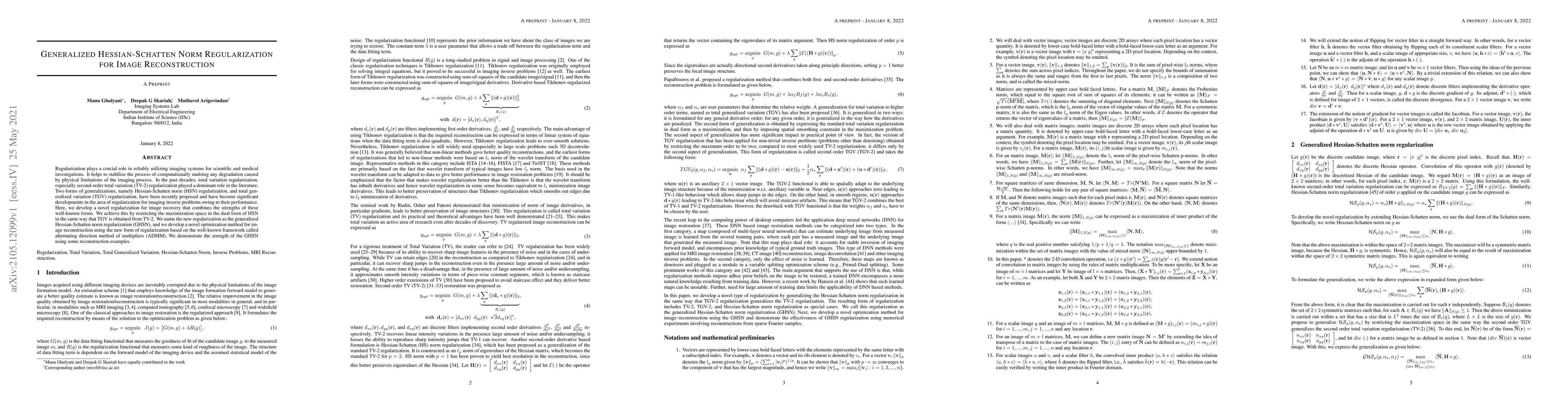 This paper introduces generalized Hessian-Schatten norm (GHSN) regularization for image reconstruction, combining strengths of Hessian-Schatten norm and total generalized variation (TGV). It utilizes the alternating direction method of multipliers (ADMM) for optimization and demonstrates improved reconstruction results.