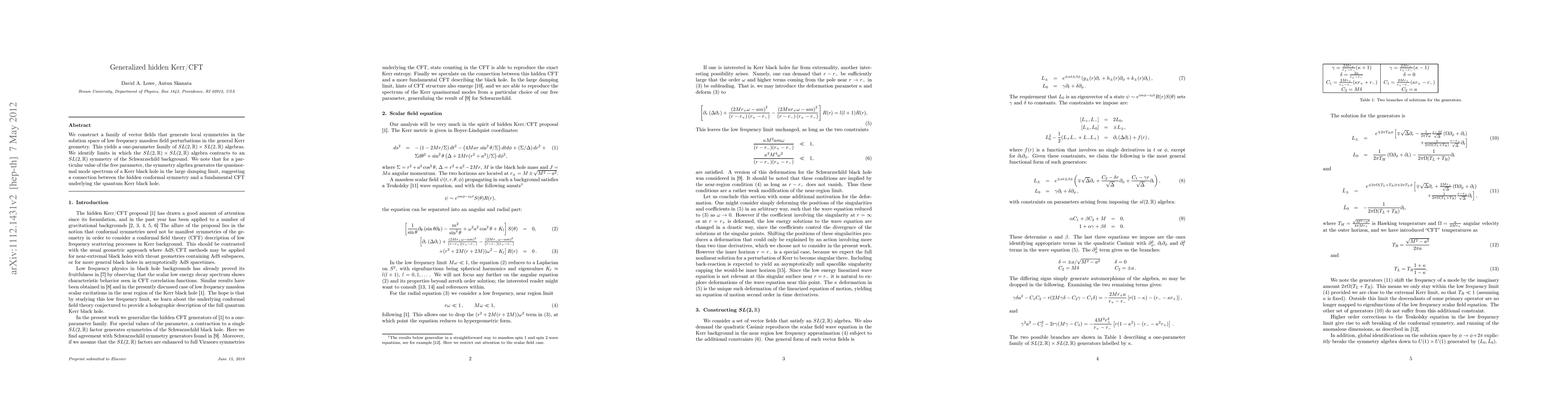 We construct a family of vector fields that generate local symmetries in the solution space of low frequency massless field perturbations in the general Kerr geometry. This yields a one-parameter family of SL(2,R)x SL(2,R) algebras. We identify limits in which the SL(2,R)xSL(2,R) algebra contracts to an SL(2,R) symmetry of the Schwarzschild background. We note that for a particular value of our new free parameter, the symmetry algebra generates the quasinormal mode spectrum of a Kerr black hole in the large damping limit, suggesting a connection between the hidden conformal symmetry and a fundamental CFT underlying the quantum Kerr black hole.