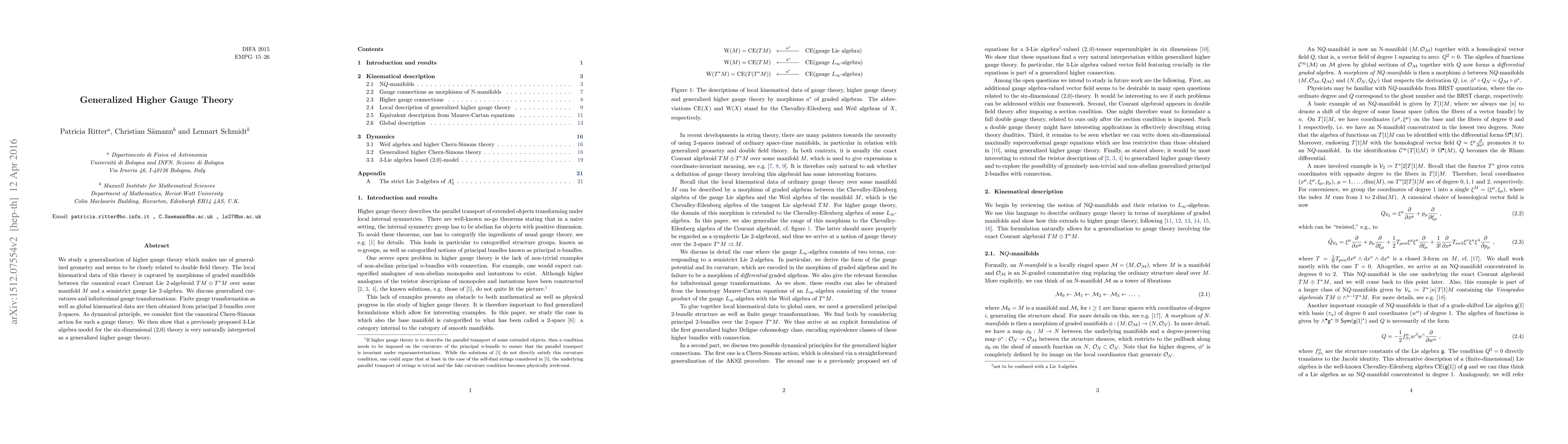 This paper generalizes higher gauge theory using generalized geometry, linking it to double field theory through morphisms of graded manifolds and Courant Lie 2-algebroids. It discusses generalized curvatures and gauge transformations, and interprets a six-dimensional (2,0) theory within this framework using the Chern-Simons action.