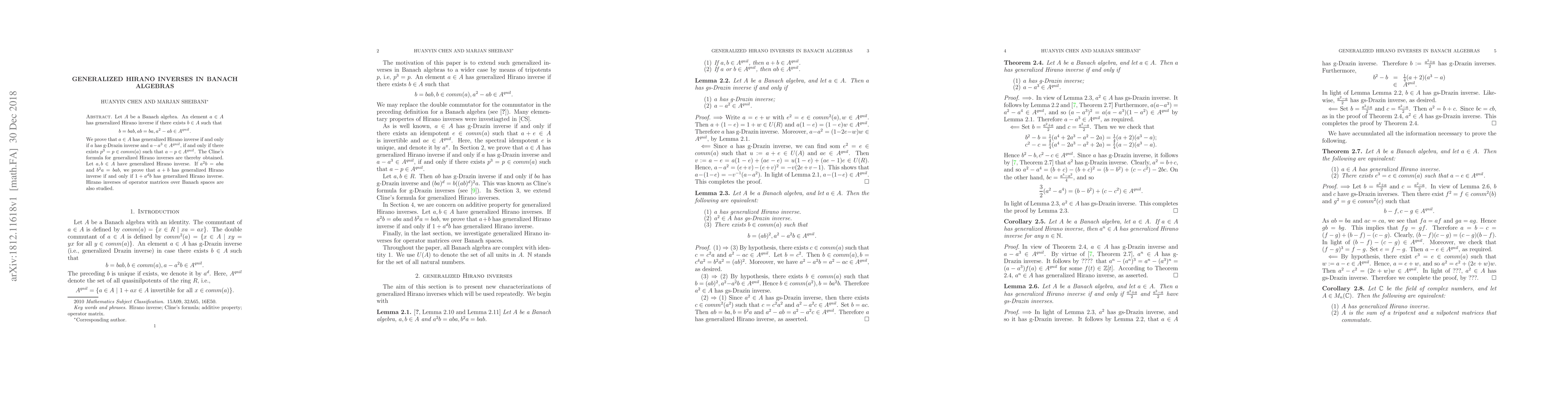 The paper introduces and develops the concept of generalized Hirano inverses in Banach Algebras, linking them to g-Drazin inverses and quasi nilpotent elements, and establishes several key properties and equivalences.