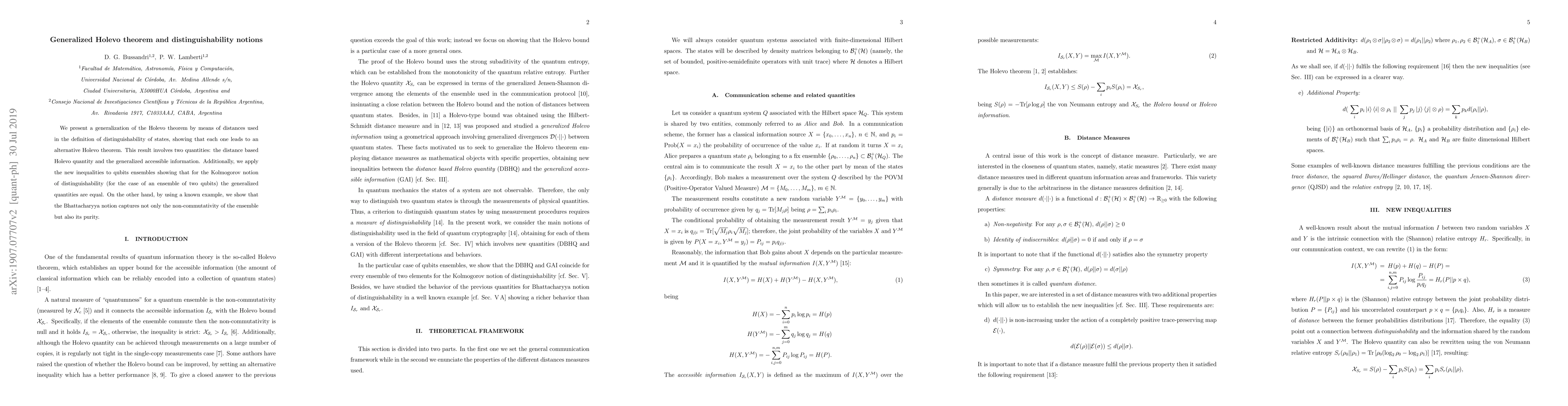This paper generalizes the Holevo theorem using different distinguishability notions, introducing generalized Holevo and accessible information. It demonstrates that the Kolmogorov distinguishability notion for two-qubit ensembles yields equal generalized quantities, while the Bhattacharyya notion highlights non-commutativity and purity.