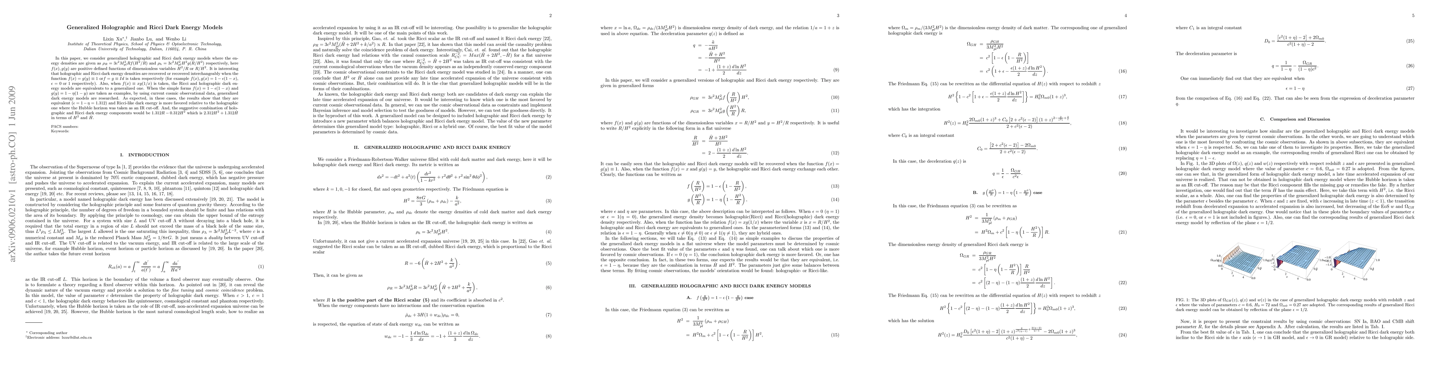 This paper explores generalized holographic and Ricci dark energy models, where energy densities depend on functions of the Ricci scalar and Hubble parameter. The study finds that these models are interchangeable under certain conditions, and when using observational data, Ricci-like dark energy is favored over holographic dark energy, suggesting a combination of $1.312 R-0.312H^2$ as a preferred model.