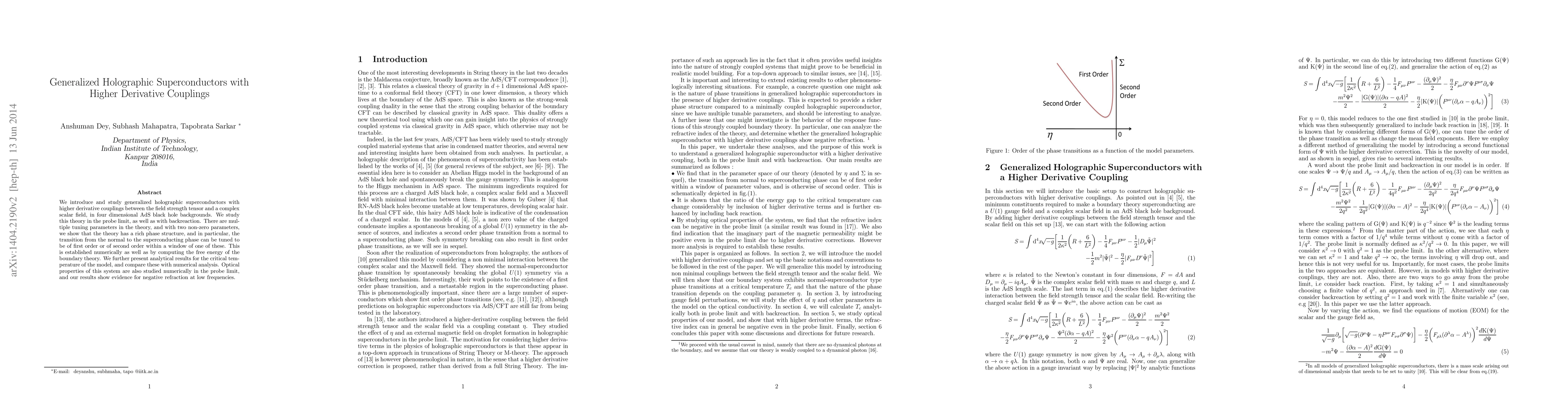 We introduce and study generalized holographic superconductors with higher derivative couplings between the field strength tensor and a complex scalar field, in four dimensional AdS black hole backgrounds. We study this theory in the probe limit, as well as with backreaction. There are multiple tuning parameters in the theory, and with two non-zero parameters, we show that the theory has a rich phase structure, and in particular, the transition from the normal to the superconducting phase can be tuned to be of first order or of second order within a window of one of these. This is established numerically as well as by computing the free energy of the boundary theory. We further present analytical results for the critical temperature of the model, and compare these with numerical analysis. Optical properties of this system are also studied numerically in the probe limit, and our results show evidence for negative refraction at low frequencies.