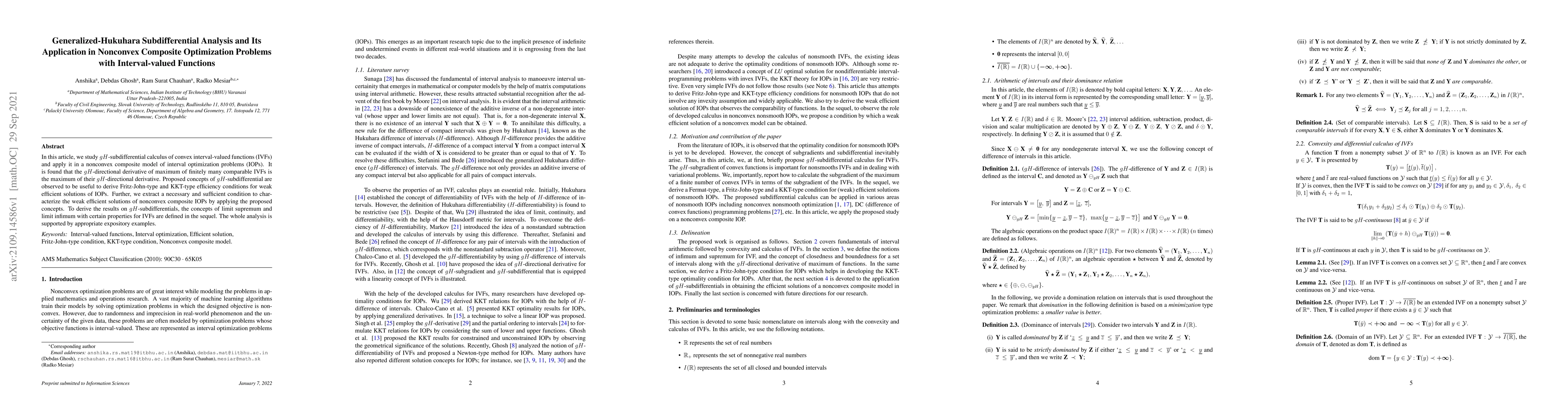 In this article, we study $gH$-subdifferential calculus of convex interval-valued functions (IVFs) and apply it in a nonconvex composite model of interval optimization problems (IOPs). It is found that the $gH$-directional derivative of maximum of finitely many comparable IVFs is the maximum of their $gH$-directional derivative. Proposed concepts of $gH$-subdifferential are observed to be useful to derive Fritz-John-type and KKT-type efficiency conditions for weak efficient solutions of IOPs. Further, we extract a necessary and sufficient condition to characterize the weak efficient solutions of nonconvex composite IOPs by applying the proposed concepts. To derive the results on $gH$-subdifferentials, the concepts of limit supremum and limit infimum with certain properties for IVFs are defined in the sequel. The whole analysis is supported by appropriate expository examples.