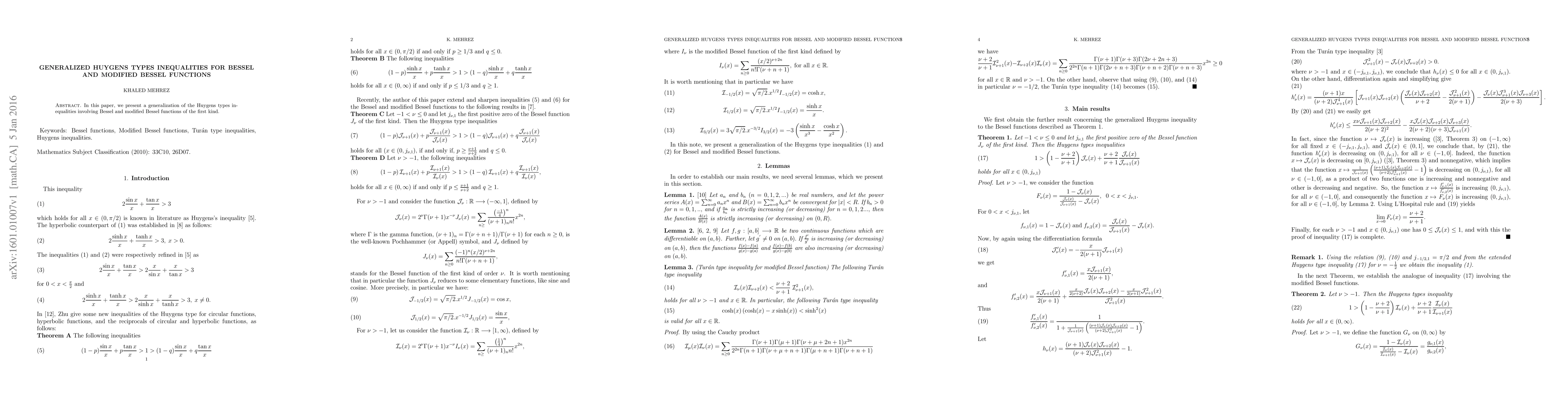 Summary: This paper generalizes Huygens types inequalities to include Bessel and modified Bessel functions of the first kind, providing new mathematical relationships and insights into these special functions.
