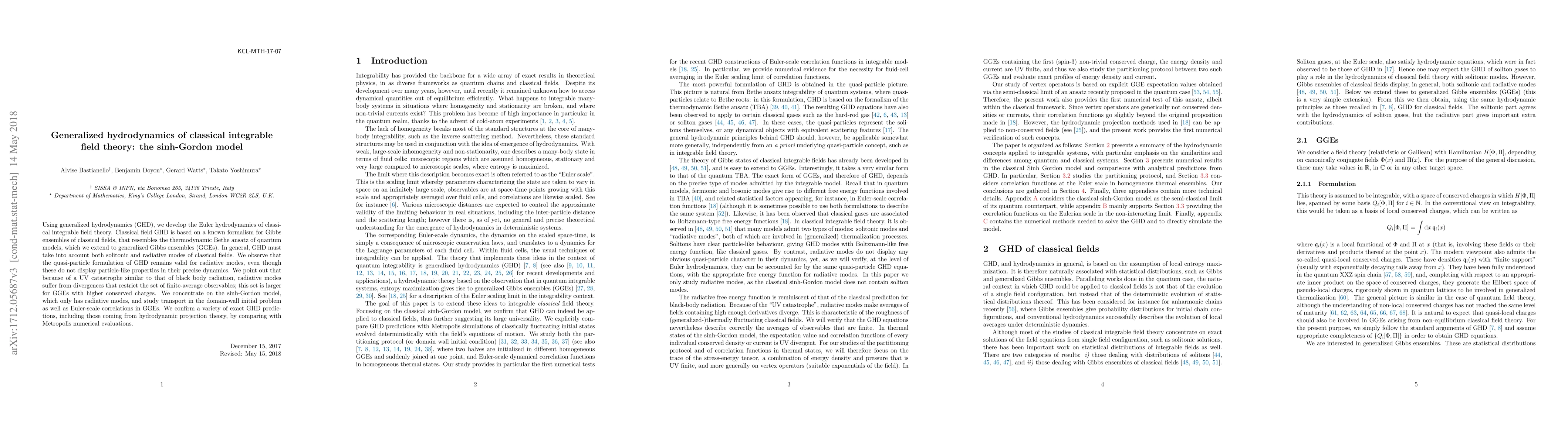 Using generalized hydrodynamics (GHD), we develop the Euler hydrodynamics of classical integrable field theory. Classical field GHD is based on a known formalism for Gibbs ensembles of classical fields, that resembles the thermodynamic Bethe ansatz of quantum models, which we extend to generalized Gibbs ensembles (GGEs). In general, GHD must take into account both solitonic and radiative modes of classical fields. We observe that the quasi-particle formulation of GHD remains valid for radiative modes, even though these do not display particle-like properties in their precise dynamics. We point out that because of a UV catastrophe similar to that of black body radiation, radiative modes suffer from divergences that restrict the set of finite-average observables; this set is larger for GGEs with higher conserved charges. We concentrate on the sinh-Gordon model, which only has radiative modes, and study transport in the domain-wall initial problem as well as Euler-scale correlations in GGEs. We confirm a variety of exact GHD predictions, including those coming from hydrodynamic projection theory, by comparing with Metropolis numerical evaluations.
