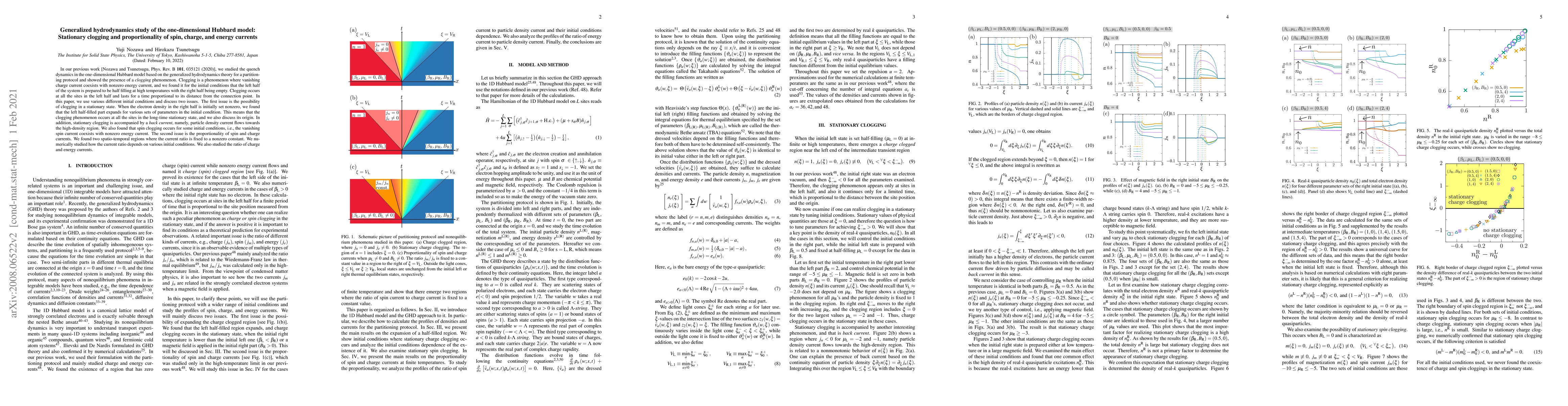 This paper investigates the one-dimensional Hubbard model under generalized hydrodynamics, revealing stationary clogging phenomena where charge and spin currents vanish while energy currents persist. It also explores the proportionality of spin and charge currents in different spatio-temporal regions, and the presence of back currents in the stationary state.