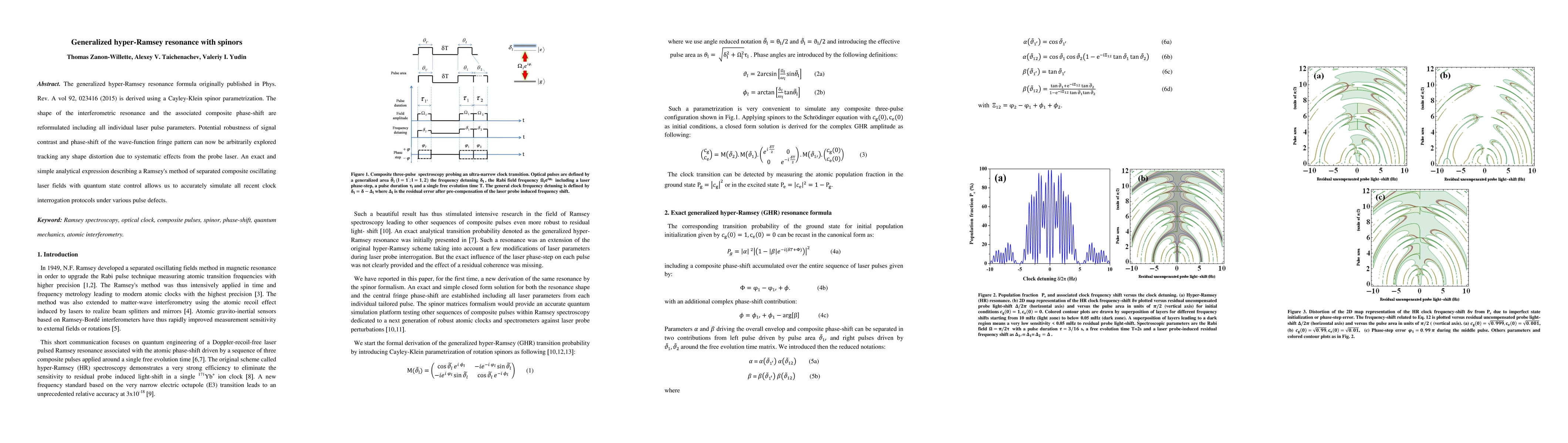 The generalized hyper-Ramsey resonance formula originally published in Phys. Rev. A vol 92, 023416 (2015) is derived using a Cayley-Klein spinor parametrization. The shape of the interferometric resonance and the associated composite phase-shift are reformulated including all individual laser pulse parameters. Potential robustness of signal contrast and phase-shift of the wave-function fringe pattern can now be arbitrarily explored tracking any shape distortion due to systematic effects from the probe laser. An exact and simple analytical expression describing a Ramsey's method of separated composite oscillating laser fields with quantum state control allows us to accurately simulate all recent clock interrogation protocols under various pulse defects.