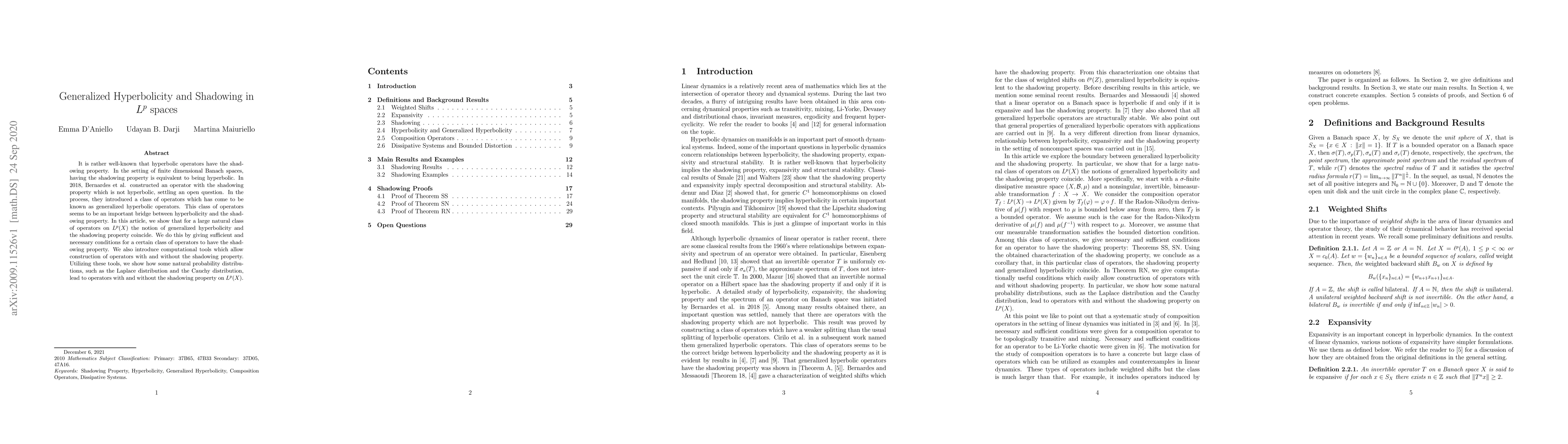 This paper investigates the relationship between generalized hyperbolicity and the shadowing property in $L^p$ spaces, demonstrating that for a significant class of operators, these two concepts are equivalent. It also provides computational tools to construct operators with and without the shadowing property, illustrating this with examples from natural probability distributions like the Laplace and Cauchy distributions.