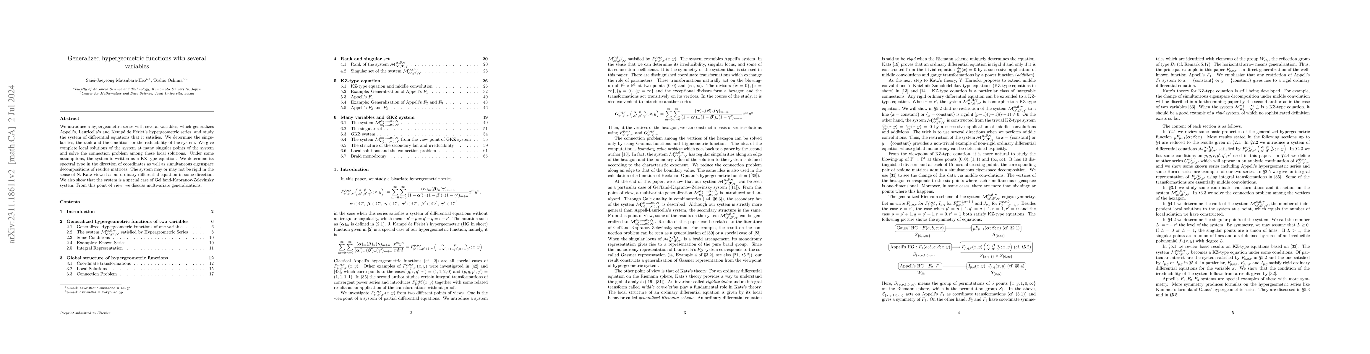 We introduce a hypergoemetirc series with two complex variables, which generalizes Appell's, Lauricella's and Kemp\'e de F\'eriet's hypergeometric series, and study the system of differential equations that it satisfies. We determine the singularities, the rank and the condition for the reducibility of the system. We give complete local solutions of the system at many singular points of the system and solve the connection problem among these local solutions. Under some assumptions, the system is written as a KZ equation. We determine its spectral type in the direction of coordinates as well as simultaneous eigenspace decompositions of residue matrices. The system may or may not be rigid in the sense of N.~Katz viewed as an ordinary differential equation in some direction. We also show that the system is a special case of Gel'fand-Kapranov-Zelevinsky system. From this point of view, we discuss multivariate generalizations.