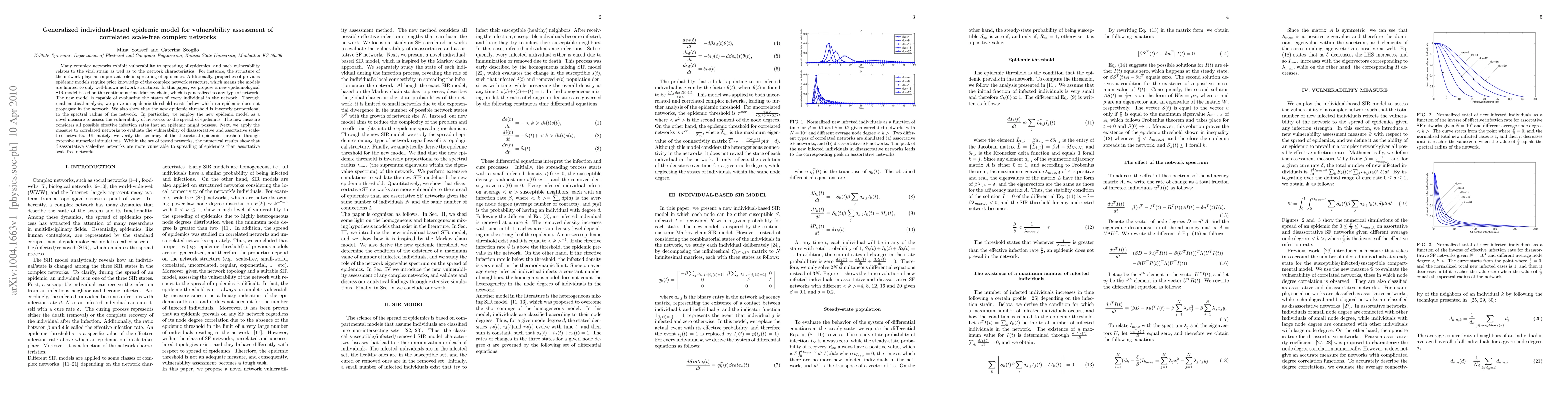 This paper proposes a generalized individual-based epidemic model based on a continuous time Markov chain to assess the vulnerability of correlated scale-free complex networks to epidemic spread. The model evaluates individual states and identifies an epidemic threshold inversely proportional to the network's spectral radius, demonstrating that disassortative scale-free networks are more vulnerable than assortative ones.