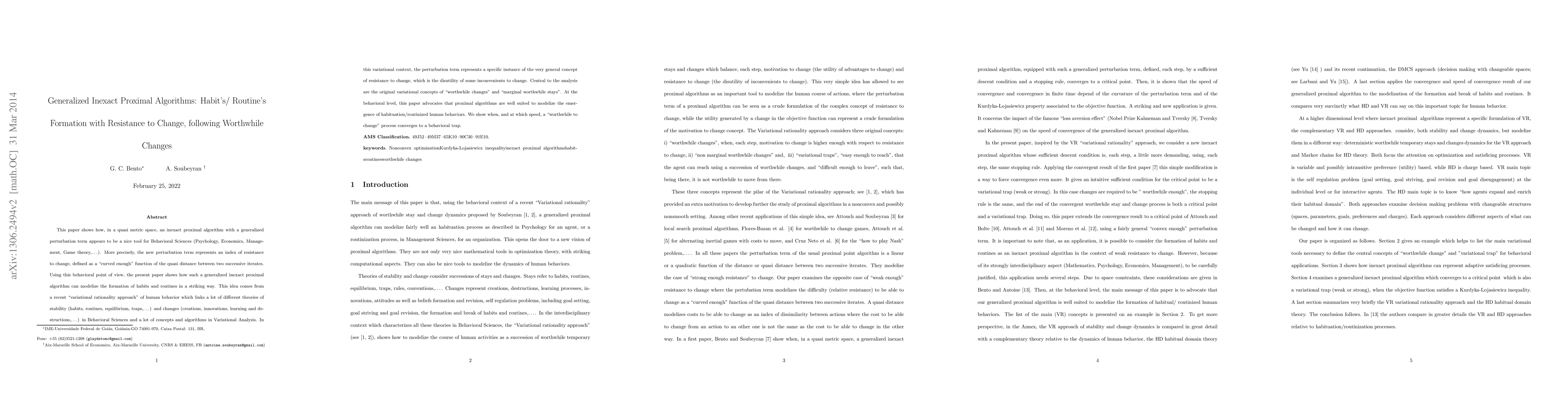 This paper shows how, in a quasi metric space, an inexact proximal algorithm with a generalized perturbation term appears to be a nice tool for Behavioral Sciences (Psychology, Economics, Management, Game theory,...). More precisely, the new perturbation term represents an index of resistance to change, defined as a "curved enough" function of the quasi distance between two successive iterates. Using this behavioral point of view, the present paper shows how such a generalized inexact proximal algorithm can modelize the formation of habits and routines in a striking way. This idea comes from a recent "variational rationality approach" of human behavior which links a lot of different theories of stability (habits, routines, equilibrium, traps,...) and changes (creations, innovations, learning and destructions,...) in Behavioral Sciences and a lot of concepts and algorithms in Variational Analysis. In this variational context, the perturbation term represents a specific instance of the very general concept of resistance to change, which is the disutility of some inconvenients to change. Central to the analysis are the original variational concepts of "worthwhile changes" and "marginal worthwhile stays". At the behavioral level, this paper advocates that proximal algorithms are well suited to modelize the emergence of habituation/routinized human behaviors. We show when, and at which speed, a "worthwhile to change" process converges to a behavioral trap.