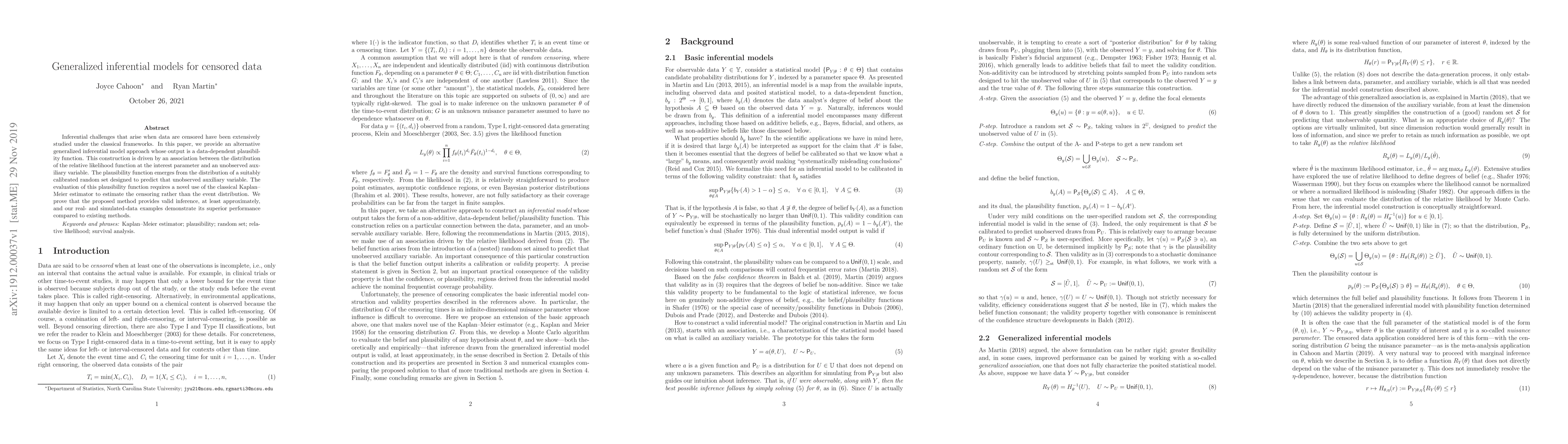 Inferential challenges that arise when data are censored have been extensively studied under the classical frameworks. In this paper, we provide an alternative generalized inferential model approach whose output is a data-dependent plausibility function. This construction is driven by an association between the distribution of the relative likelihood function at the interest parameter and an unobserved auxiliary variable. The plausibility function emerges from the distribution of a suitably calibrated random set designed to predict that unobserved auxiliary variable. The evaluation of this plausibility function requires a novel use of the classical Kaplan--Meier estimator to estimate the censoring rather than the event distribution. We prove that the proposed method provides valid inference, at least approximately, and our real- and simulated-data examples demonstrate its superior performance compared to existing methods.
