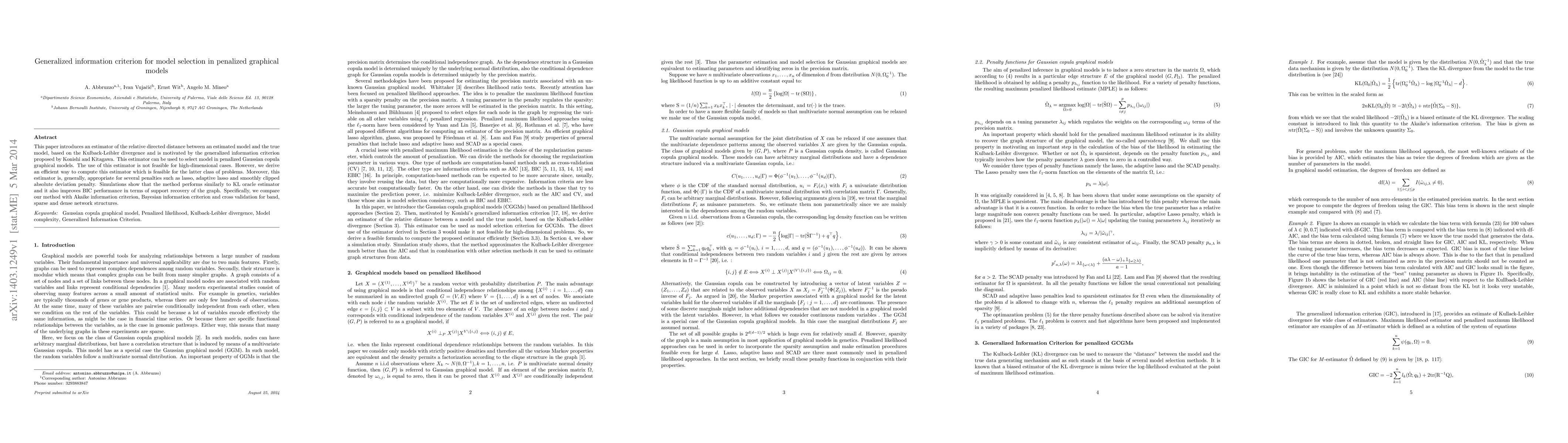 This paper introduces an estimator of the relative directed distance between an estimated model and the true model, based on the Kulback-Leibler divergence and is motivated by the generalized information criterion proposed by Konishi and Kitagawa. This estimator can be used to select model in penalized Gaussian copula graphical models. The use of this estimator is not feasible for high-dimensional cases. However, we derive an efficient way to compute this estimator which is feasible for the latter class of problems. Moreover, this estimator is, generally, appropriate for several penalties such as lasso, adaptive lasso and smoothly clipped absolute deviation penalty. Simulations show that the method performs similarly to KL oracle estimator and it also improves BIC performance in terms of support recovery of the graph. Specifically, we compare our method with Akaike information criterion, Bayesian information criterion and cross validation for band, sparse and dense network structures.