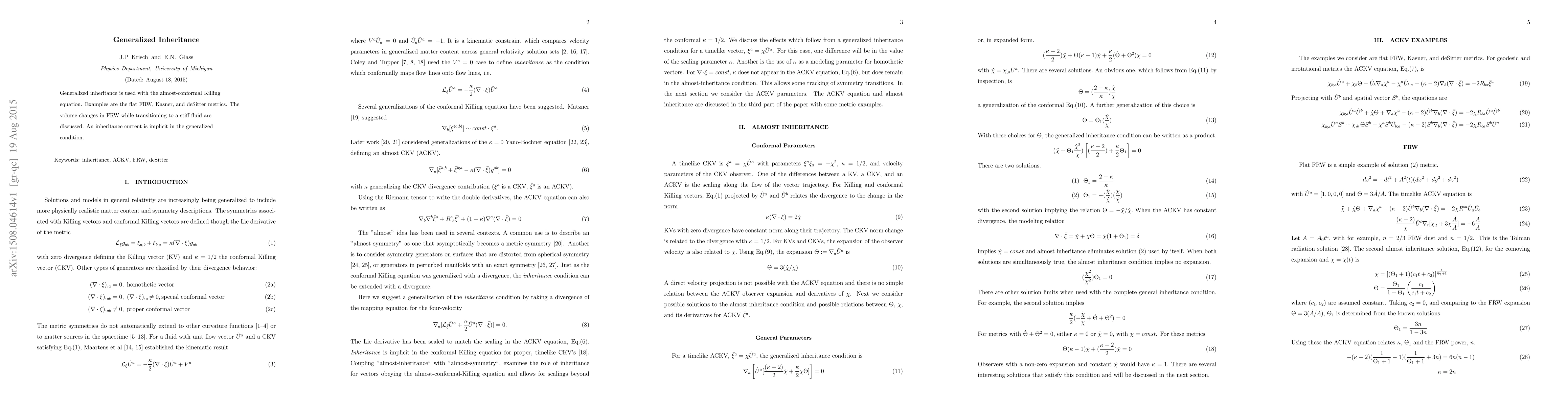 Title: Generalized Inheritance Summary: This paper explores the concept of generalized inheritance in relation to the almost-conformal Killing equation, focusing on metrics like FRW, Kasner, and deSitter, and discusses volume changes in FRW transitioning to a stiff fluid, highlighting an implicit inheritance current in the generalized condition.