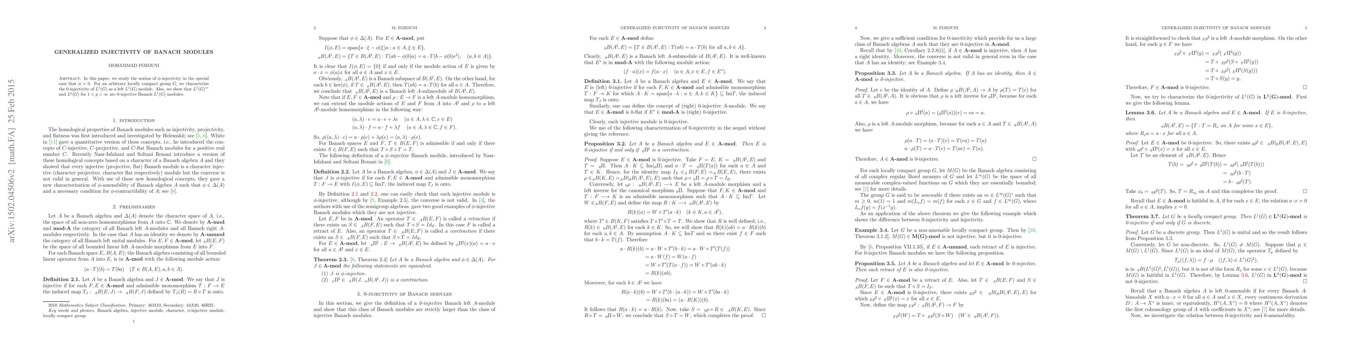 This paper investigates the concept of 0-injectivity in Banach modules, specifically for $L^{1}(G)$ as a left $L^{1}(G)$ module for an arbitrary locally compact group $G$. It demonstrates that $L^{1}(G)^{**}$ and $L^{p}(G)$ for $1<p<\infty$ are also 0-injective Banach $L^{1}(G)$ modules.