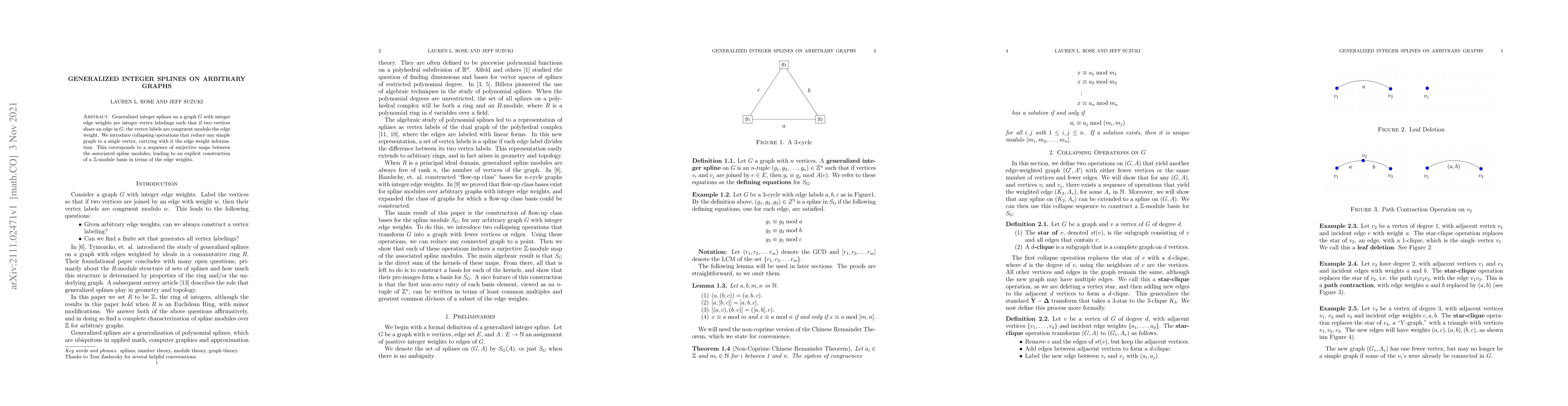 This paper introduces generalized integer splines on arbitrary graphs, where vertex labels are congruent modulo edge weights for connected vertices. It presents collapsing operations to reduce graphs to single vertices, establishing a module basis based on edge weights.